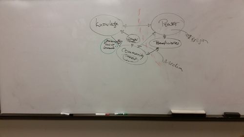 An attempt was made to develop a conceptual model of how knowledge is used or impacts in societal decision making. The sketch reproduced below indicates the interplay between society as a whole, the collective knowledge, and those representing the power inside a society.