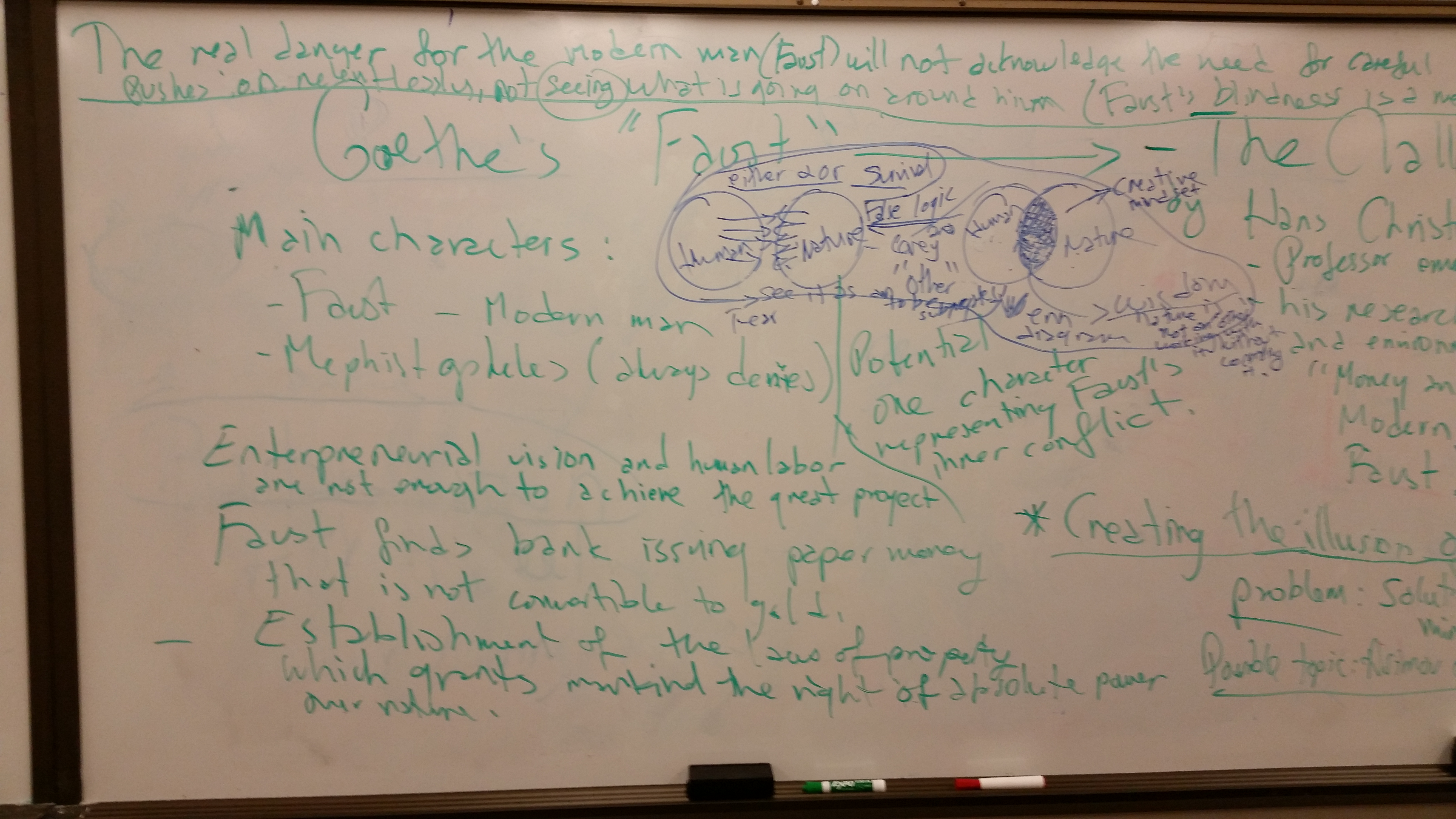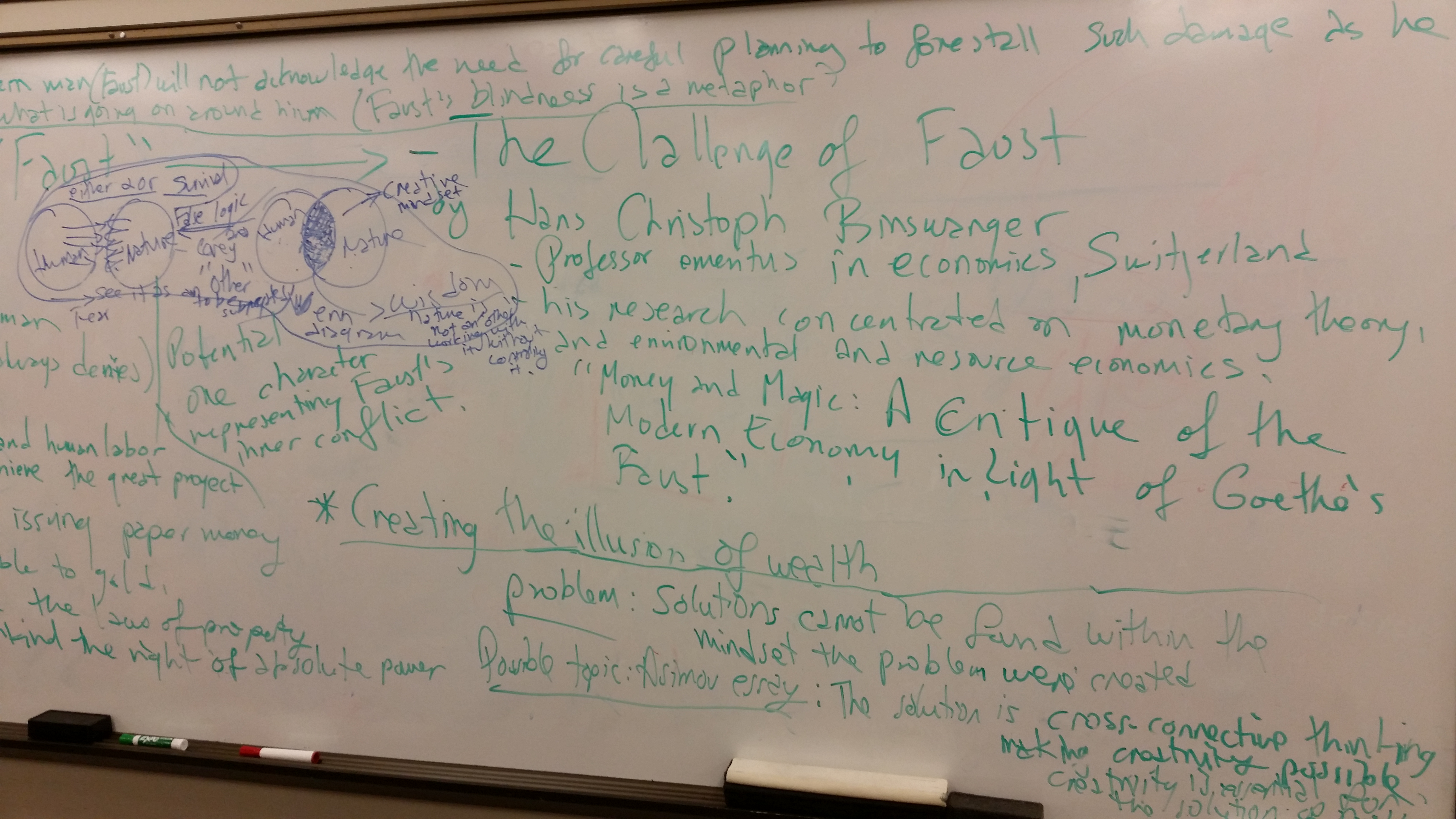The first part of the session focused on a discussion of Hans Christoph Binswanger’s essay "The Challenge of Faust" in terms of its main focus: how Goethe "confronts the promises and pitfalls of the Industrial Revolution and the economic growth that it generated," based on a critical analysis of Part II of Goethe’s play, Faust (1832). At an early point in the discussion, it was clarified that Binswanger's article, "The Challenge of Faust," is based on Goethe's "Faust." (Johann Wolfgang von Goethe: "German poet, playwright, novelist, and natural philosopher is best known for his two-part poetic drama Faust, (1808-1832) which he started around the age of twenty three and didn't finish till shortly before his death sixty years later. He is considered one of the greatest contributors of the German Romantic period.").
