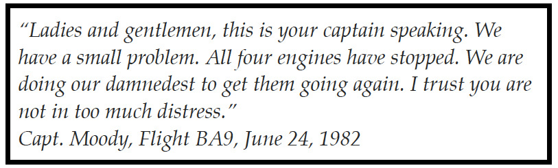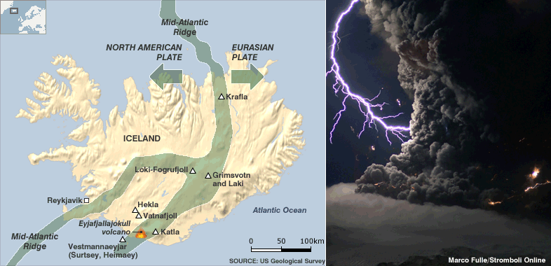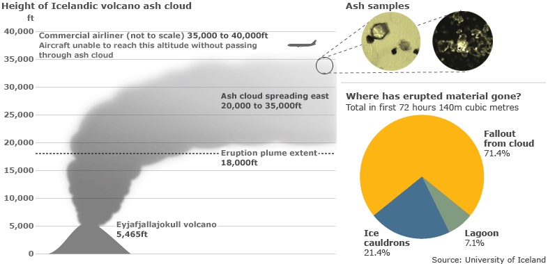 Plumes And AircraftAsh plumes and ash clouds from volcanic eruptions have caused aircraft engine failure. Intersection with a thick ash cloud from Mount Galunggung volcano, near Jakarta, Indonesia, caused all 4 jet engines to fail on British Airways Flight #9 on June 24, 1982 (Fig. 11a). Fortunately, the flight crew were able to glide the airplane to a safe landing. A similar incident occurred on December 15, 1989, when KLM Flight #867 flew through an ash cloud emanating from Alaska’s Mount Redoubt. The flight dropped 4,000 m in 8 minutes before the aircraft’s engines were able to be restarted and the plane safely landed. In April 2010, an ash plume from Iceland's Eyjafjallajökull volcano (Fig. 11b) reached a height of 5,500 m (18,000 ft) before high altitude winds dispersed it into a diffuse ash cloud over western Europe (Fig. 11c). Although this was not an especially large volume eruption, commercial air traffic was disrupted throughout Europe for several weeks.