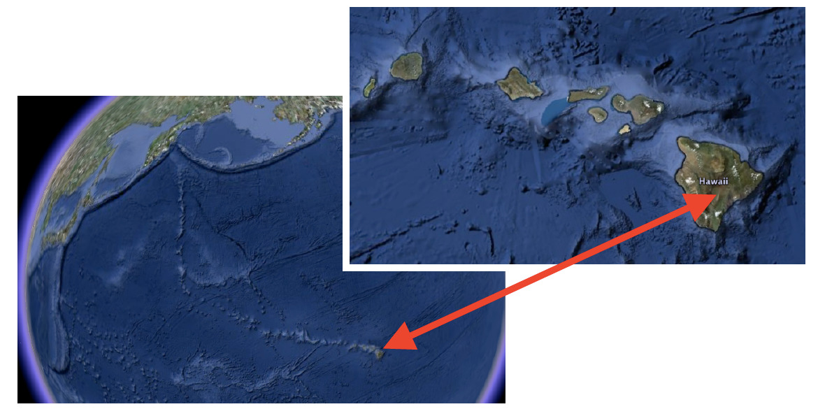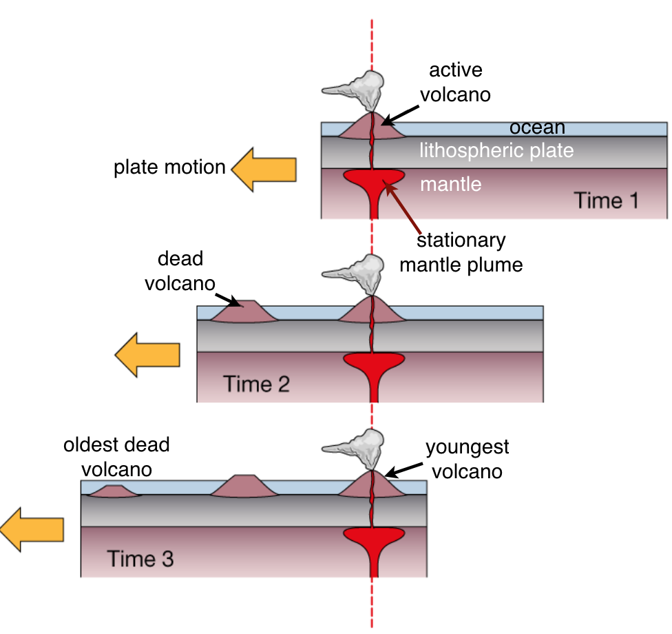 The Hawaiian Island ChainThe Hawaiian Islands formed above a mantle hot spot and are composed of active, dormant, and extinct volcanoes, with the active ones forming the easternmost islands. Although they are in the middle of the Pacific Ocean, the Hawaiian Islands did not form above a divergent plate boundary. The islands are the youngest of a chain of basaltic shield volcanoes and seamounts in the Pacific Ocean that becomes progressively older westward, away from Hawai’i, and extends 5,800 km to Kamchatka, Russia (Fig. 6a). Each of the more than 80 volcanoes in the chain is thought to have formed above the same localized ‘hot spot’ plume of magma which rises from the mantle (Fig. 6b) through the oceanic crust and is currently located beneath Hawai’i. There are currently four active volcanoes on the Hawaiian Islands. A fifth active volcano, Lo’ihi, is growing underwater on the eastern flanks of Kilauea and Mauna Loa. Although its summit is still more than 900 m below sea level, Lo’ihi is poised to become the newest Hawaiian Island.