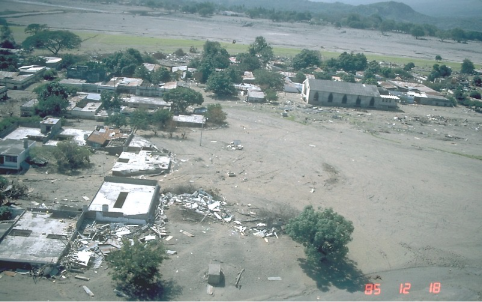LaharsRivers of tephra and water slurry, called lahars, are a danger to those who live near volcanoes. Stratovolcanoes with snowcaps, crater lakes, or in areas of heavy rains, are especially dangerous during an eruption. The water mixes with tephra to form a mud- and rock-rich slurry, called a lahar, that forms a fast-moving flow of debris down the volcano’s flanks and down-valley (Fig. 13a). Although lahars most often occur during an eruption, heavy rain can trigger them at any time. The eruption of Nevada del Ruiz in Colombia, in 1985, created one of the worst lahar disasters of recent decades. Lahars flowed for over 100 km down the valley of Río Lagunillas, engulfing the town of Armero in up to 5 m of volcanic mud and rock (Fig. 13b). More than 23,000 people were killed and more than 5,000 homes were destroyed. For those who live in valleys that radiate from active volcanoes, the risk of a lahar may be mitigated to some extent by levees, although these may be overrun by extremely large lahar flows.