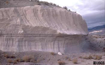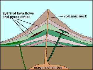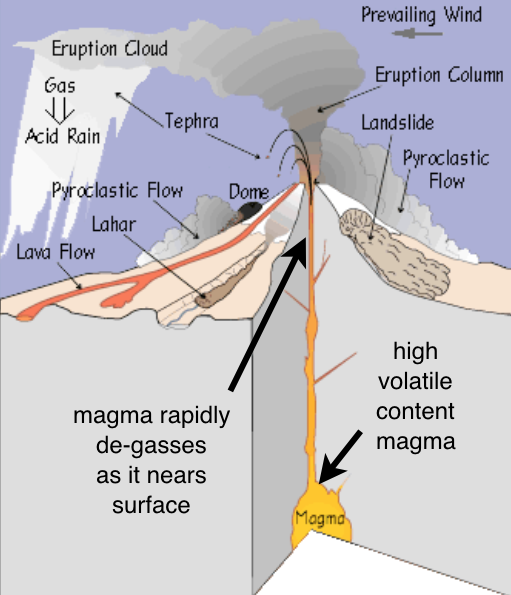 StratovolcanoesStratovolcanoes, also called composite volcanoes, are highly dangerous. They can explosively erupt ash, fast-moving pyroclastic flows, and lava. Volcanoes that form along subduction zones have viscous, silica-rich lava that originates as magma in the mantle above the subducting plate (Fig. V8a). Three of the most common varieties of this type of lava are called rhyolite, dacite, and andesite (after the Andes mountains). These lavas do not flow easily and can clog the volcano’s conduits. Gas becomes trapped in the lava, eventually creating explosive bursts of hot ash, gas, and rock fragments called pyroclastic flows that build a composite stratovolcano (Fig. 8a). The sticky lava that flows from the volcano’s vents cannot travel very far, however pyroclastic flows are fluid and can travel many kilometers. Volcanic ash from stratovolcanic eruptions is often voluminous (Fig. 8b), thickly blanketing broad regions downwind and falling in lesser amounts hundreds or even thousands of kilometers away.