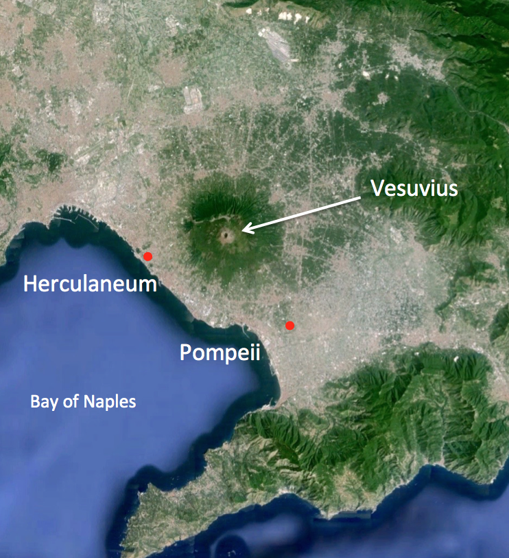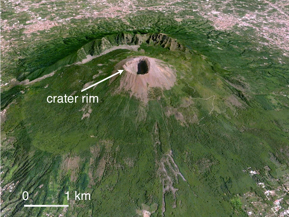 Vesuvius and PompeiiItaly’s Mount Vesuvius buried the Roman cities of Pompeii and Herculaneum in ash and pyroclastic deposits in A.D. 79. Vesuvius is a typical stratovolcano (Fig. 14a) located near today’s city of Naples, Italy (Fig. 14b). Moderate earthquakes are frequent in the region and one in A.D. 62 had already damaged the Roman cities of Pompeii and Herculaneum before Vesuvius explosively erupted on August 24, A.D. 79, sending a plume and cloud of ash and gas at least 30 km into the atmosphere. Pumice fell onto Pompeii during the first of several pyroclastic flows to engulf the city and regions south of the volcano in deposits almost 3 m thick. At least 1,500 citizens were buried beneath thick pumice and ash (Fig. V14b). A lahar buried the city of Herculaneum the next day. The explosive eruption and its sustained plume of ash was chronicled by Pliny the Younger. Similarly violent stratovolcano eruptions are therefore sometimes referred to as Plinian eruptions.