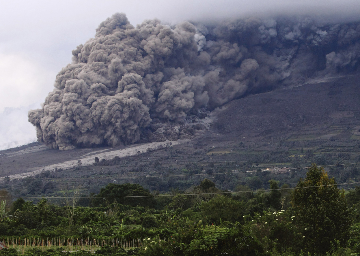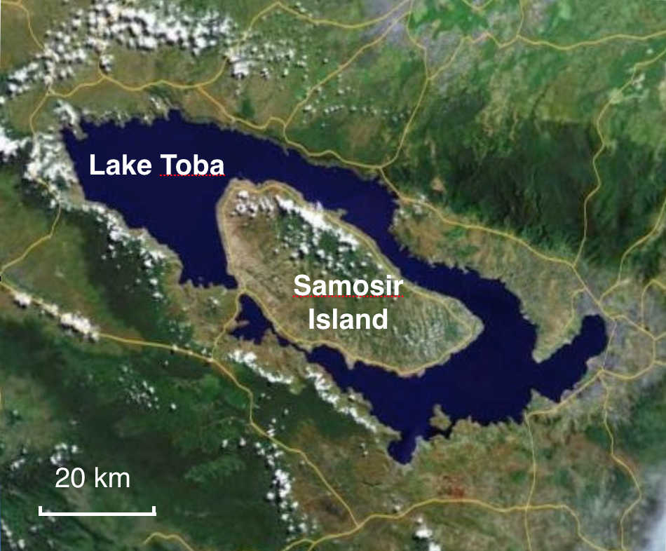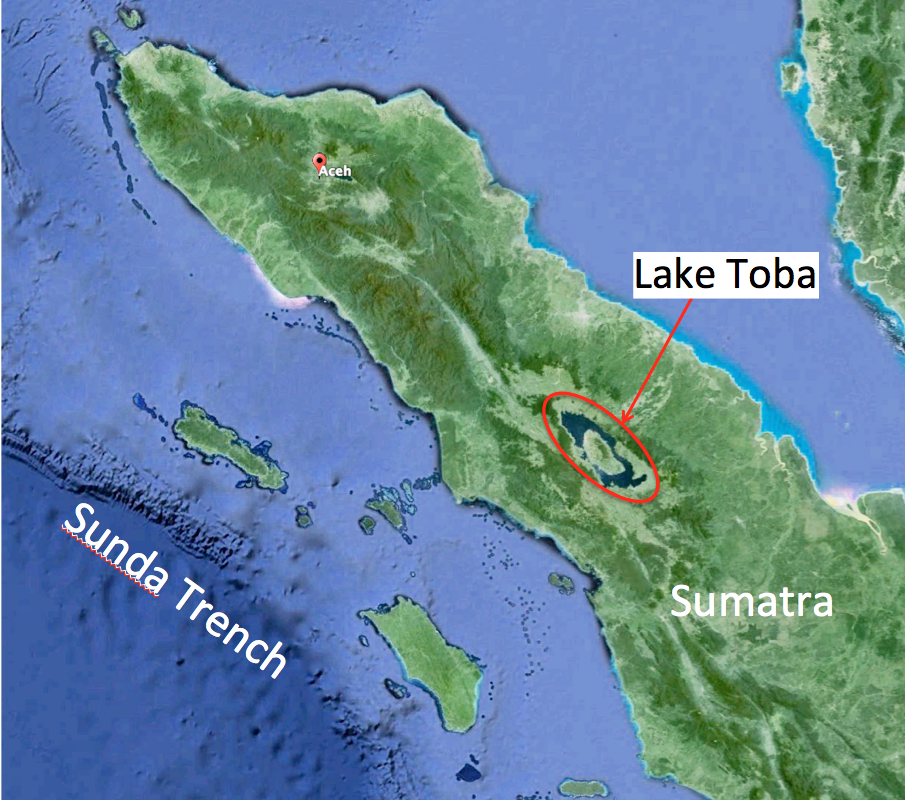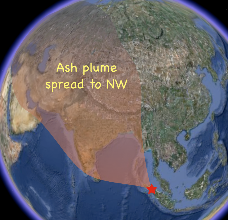 Supervolcano TobaToba erupted 74,000 years ago in a cataclysmic explosion, spewing a cloud of ash and gas that caused temporary global cooling. The biggest explosive volcanic event of the last 2 million years occurred on Sumatra, in Indonesia. Two major eruptions occurred in the region at 840,000 and 700,000 years ago, and others have occurred at roughly 400-year intervals, but these were dwarfed 74,000 years ago when one or more of Toba’s volcanoes collapsed to form a huge caldera (Fig. 22a). More than 700 million tons (2,800 km3) of ash and pyroclastic material were ejected in this supervolcano eruption. Toba’s catastrophic eruption created a plume of ash and sulfur dioxide gas that was carried by prevailing winds into a cloud that blocked sunlight over the northern hemisphere for a decade, causing at least a 3oC drop in global average temperatures. Ash fall from the eruption has been traced over much of India (Fig. 22b) and can even be detected in ice cores from Greenland. Evidence from mitochondrial DNA suggests that the combined effect of the explosion, tsunamis, and ash fall was enough to greatly reduce genetic diversity in homo sapiens at the time.