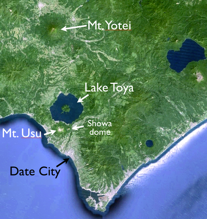 Crater Lake HazardsLakes that form inside craters and calderas are beautiful, but may also pose a significant hazard. Many tourists visit crater lakes to enjoy their clear waters and symmetrical form (Fig. 16a). However, in a volcanically active region, these lakes are a water source that can mix with ejected tephra to form deadly lahars, or form an explosive mix with lava in any subsequent eruptions. Lake Toya is a large caldera lake in northern Japan (Fig. 16b) that has central resurgent domes, hot springs around its margin, remains ice-free in winter despite its northern latitude, and is promoted as a spa resort. Mt. Usu, an active stratovolcano on the edge of the 110,000 year-old caldera, has erupted on a 30 to 50 year cycle, most recently in 1977 and 2000. On the flank of Mt. Usu, a new 400 m-high lava-dome (Fig. 16c), pushed up unexpectedly through wheat fields after a series of strong earthquakes in 1944 and 1945. The volcano is closely watched by the residents of the nearby resort city of Date, which has a population of about 40,000.