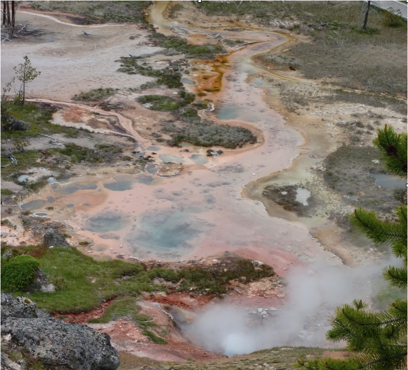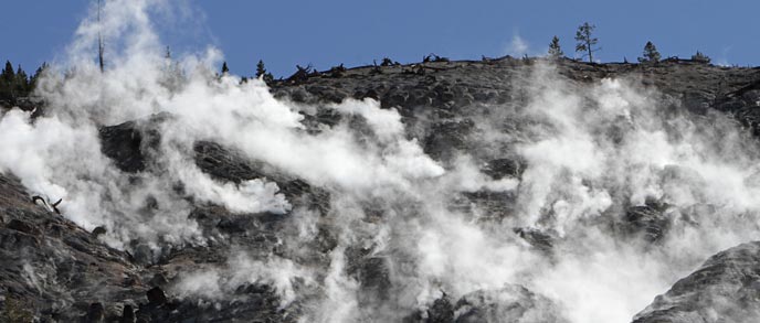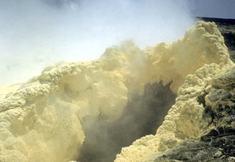 FumarolesMost of the vapor emitted from fumaroles is superheated steam, but toxic gases are also emitted and condense into acidic pools and lakes. Volcanic gases escape to surface through cracks and fissures known as fumaroles (Fig. 17a). Water vapor (steam), carbon dioxide, and sulfur dioxide at temperatures of over 400oC are the most abundant fumarole emissions. These are usually localized emissions that are relatively harmless, although they can appear without warning above active and even dormant volcanoes. The superheated gas can disperse quickly into the atmosphere, where it creates acid rain, or erupt as a hot water and gas mixture in a geyser (Fig. V17), or condense into deceptively clear, but hot and acidic pools (Fig. 17c). Other common and hot gas emissions include carbon monoxide, hydrogen sulfide, hydrogen fluoride, and hydrogen chloride, all of which are toxic and cause serious respiratory problems that can be lethal for humans and for livestock.