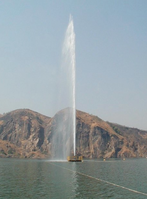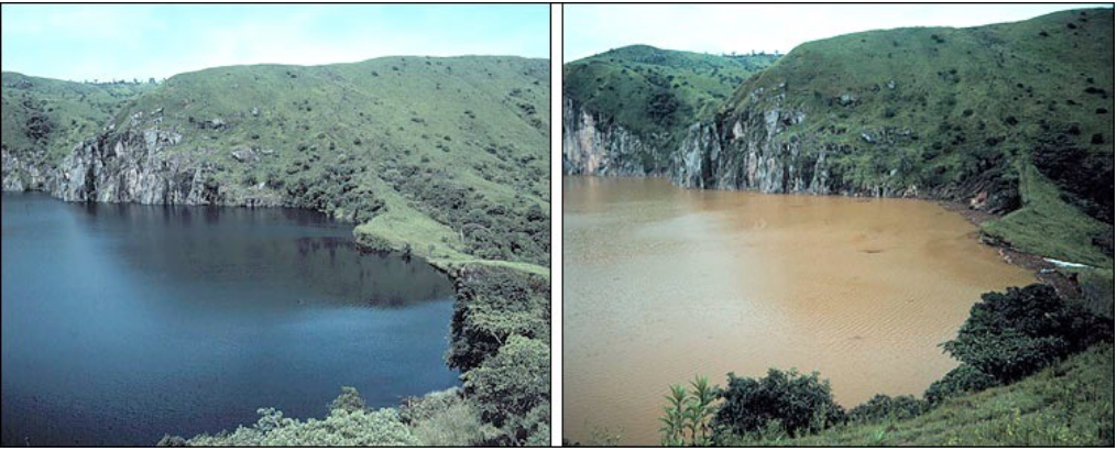 Mitigating Volcanic GasesDangerous carbon dioxide build-up in lake bottom sediments can be prevented by controlling the gas, allowing it to escape gradually to surface. Where soluble volcanic gases, such as CO2, bubble through water on their way to surface, some of the gas goes into solution, acidifying the water. Under the high pressure of deep water, such as at the bottom of a lake, CO2 can build to high concentrations. To mitigate against another catastrophic build-up of lethal gas from Lake Nyos, such as occurred in 1986 (and also to a lesser degree in 1984), a control system now releases the CO2 gas in a steady, harmless stream (Fig. V19a). Lake Monoun, also in Cameroon, and Lake Kivu in East Africa have similar problems of CO2 gas accumulation (Fig. 19b). Goma City, on Lake Kivu, was partially destroyed in 2002 when Mt. Nyiragongo erupted. Goma City’s volcano observatory now monitors the condition of Lake Kivu and Nyiragongo.