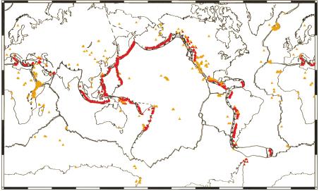 Class 6: VolcanoesVolcanoesVolcanoes are localized places where molten rock and ash mingled with toxic gases and steam erupts onto the surface of the Earth or other planetary bodies. On Earth, active volcanoes are located on divergent or convergent plate boundaries, or above isolated 'hot spots' in the Earth's mantle. Dictionary definitions of 'volcano; generally state that they are cone-shaped mountains with a crater or vent from which magma (molten rock), gases, and hot rocks are ejected. This simple definition fits most people’s idea of a volcano (Fig. 1a), even though many volcanoes are not conical, not all volcanoes are active, and not all eruptive vents in the crust form volcanoes. The majority of visibly active volcanoes are located on convergent plate boundaries (Fig. 1b), such as as the Ring Of Fire around the Pacific Ocean. Chains of submarine volcanoes also comprise Earth’s mid-ocean ridges. Other volcanoes sit above 'hot spots,' areas of localized high heat flow from Earth's mantle that are not necessarily associated with present day plate boundaries.