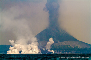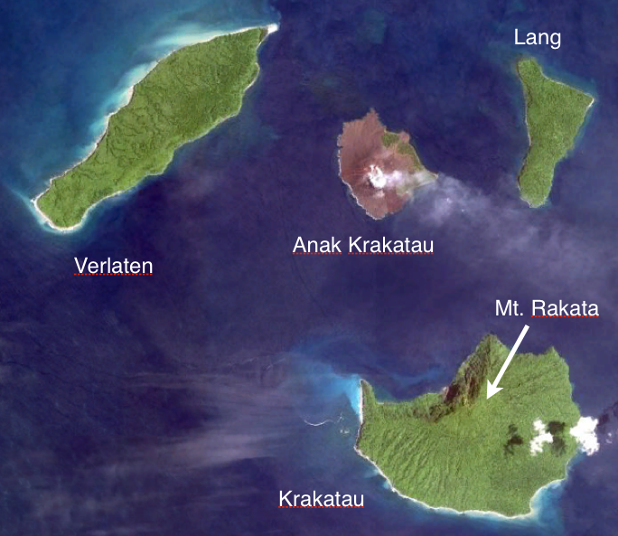KrakatoaThe volcanic island of Krakatoa, Indonesia, exploded on August 27, 1883, causing a tsunami that killed nearly 36,000 people. Krakatoa (also called Krakatau) is one of many active stratovolcanoes in the Sunda Strait, between Java and Sumatra, Indonesia. In the 1800’s, Krakatoa was an uninhabited island in the middle of an existing 7 km-wide caldera (Fig. V20a). On August 27, 1883, the volcanic island erupted in four explosions that blew away two thirds of the island (Fig. V20b) and were heard almost 5,000 km away. Over 36,000 people were killed by the resulting tsunami. Pyroclastic flows travelled for 40 km across the surface of the Sunda Strait to the coast of Sumatra. The ash plume reached an estimated height of 80 km (Fig. 20b) and over the next year, global temperatures fell by 1.2°C. In 1927, a new volcano called Anak Krakatau (“Child of Krakatau”) appeared in the center of the caldera. The active volcano (Fig. 20b) continues to grow at an average rate of 13 cm per week.