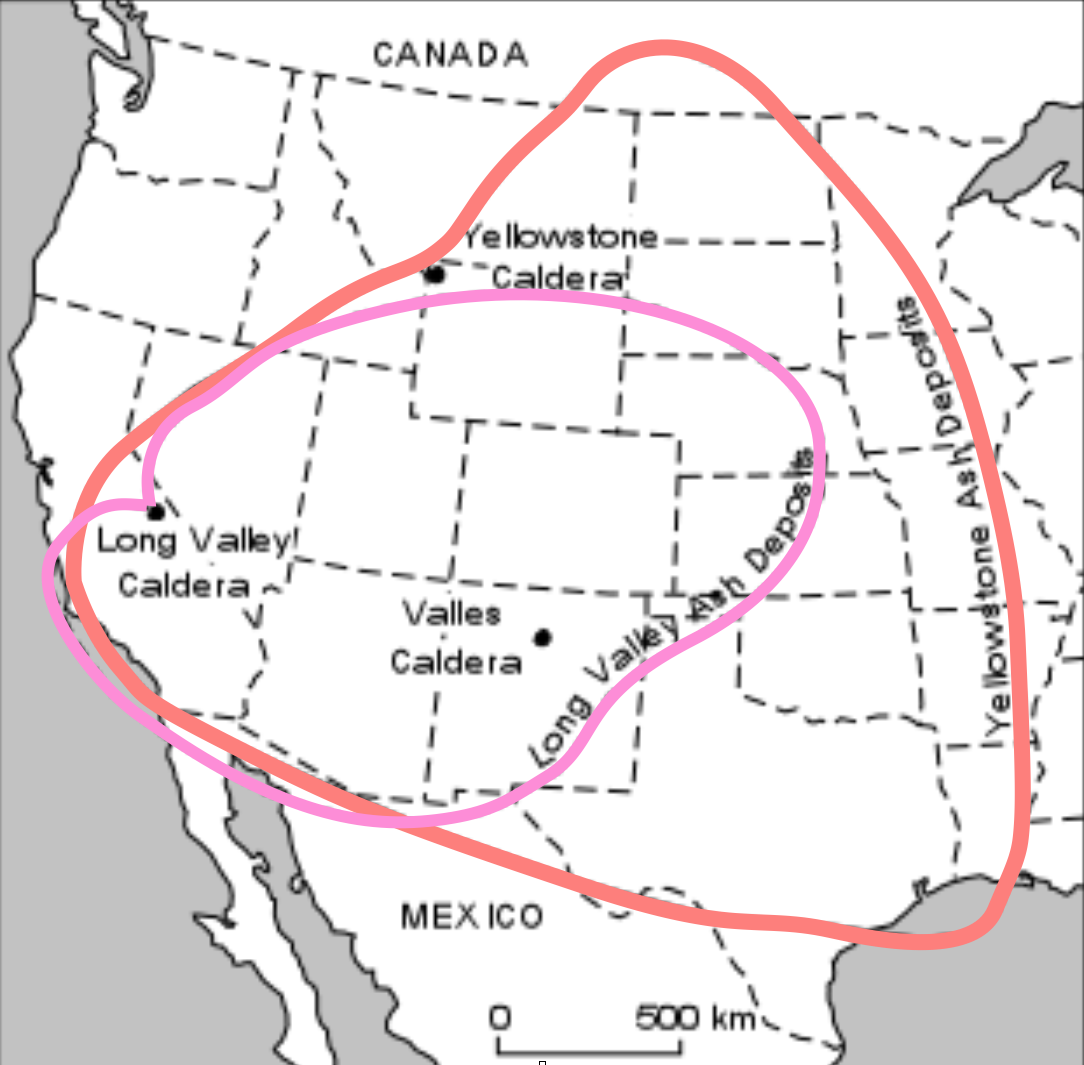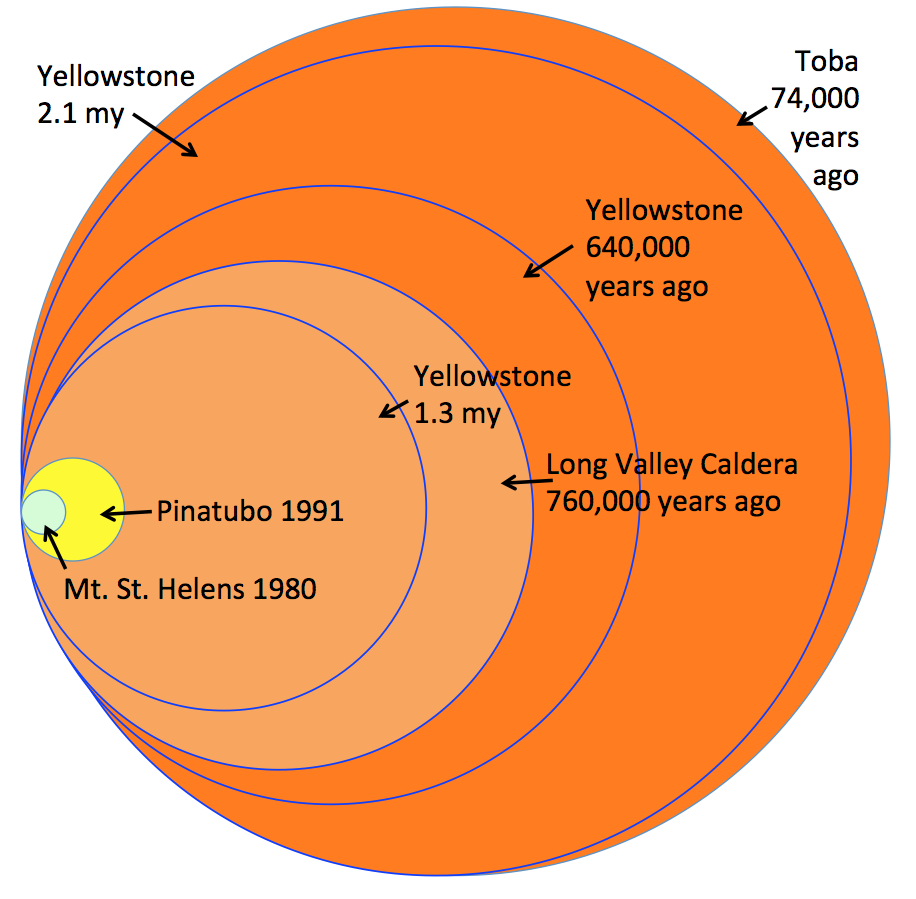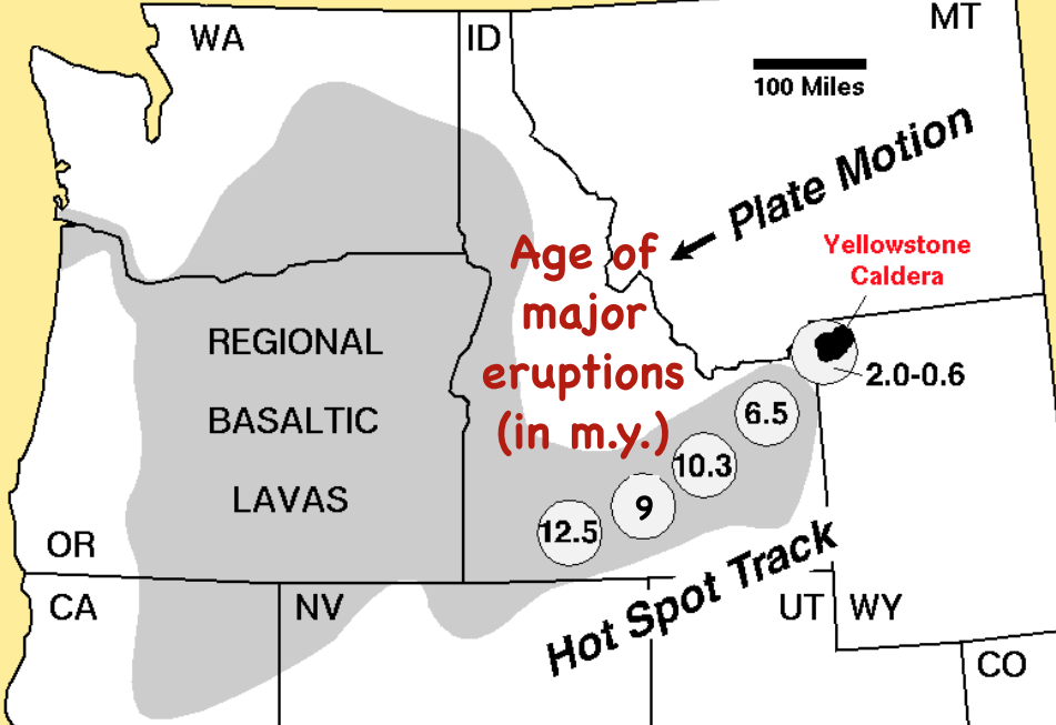 Yellowstone’s SupervolcanoA supervolcano is a volcano that produces more than 1,000 km3 of volcanic deposits in a single eruption. Yellowstone has done so, twice, along with many smaller, yet still significant, eruptions. The Yellowstone volcanic field has had a long history, starting over 16 million years ago (16 my) when the North American Plate began moving over a mantle hot spot (Fig. 21a). At 2.1 my, a single eruption produced over 2,450 km3 of ash deposits, some of which drifted well to the east of the Rocky Mountains (Fig. 21b). Another eruption at 0.64 my created the present day Yellowstone Caldera and produced over 1,000 km3 of tephra in a single eruptive event, which is now used as the definition of a ‘supervolcano’. The only larger eruption in the past 2 million years is that of Toba, Indonesia, at 0.74 my. (Fig. 21b). Yellowstone’s last eruption – mostly lava flows and a little tephra – occurred 70,000 years ago. The hot spot is now beneath the thick crust of the Rocky Mountains and therefore another cataclysmic eruption is considered very unlikely.