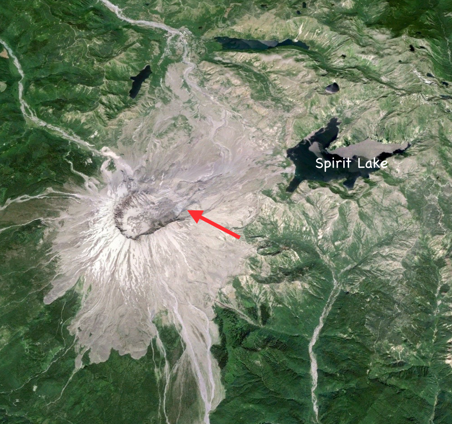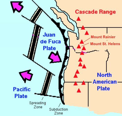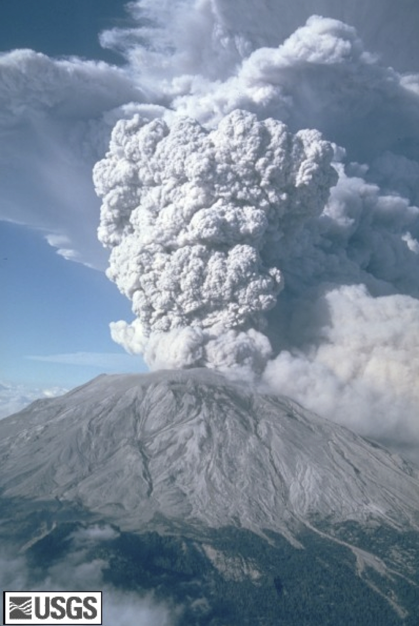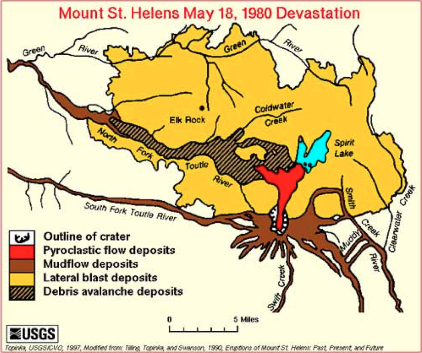 Mt. St. Helens, Cascade RangeThe 1980 eruption of Mt. St Helens in the Cascades Range of western North America unexpectedly blew away one side of the mountain. Volcanoes in the Cascade Range sit above the subduction zone between the Juan de Fuca Plate and the North American Plate (Fig. 24a). In early spring of 1980, seismic activity increased beneath Mount St. Helens and the north side of the volcano started to bulge outward. On May 18, 1980, the mountainside above the bulge unexpectedly blew apart and collapsed in an avalanche of debris. The sudden reduction of pressure on the magma inside the volcano produced an explosive lateral eruption, with a pyroclastic flow that travelled as far as Spirit Lake (Fig. 24b) and a 24 km-high ash column Lahars raced down each of the valleys that radiate from the volcano. Although a mandatory evacuation order had been issued for the region around the volcano on April 30, several individuals had been allowed back into the area on May 17 to collect belongings. In total, fifty-seven people were killed, mostly by asphyxiation, including a geologist who had been monitoring the volcano. Mount St. Helens was again active, on a smaller scale, in 2004–2008.