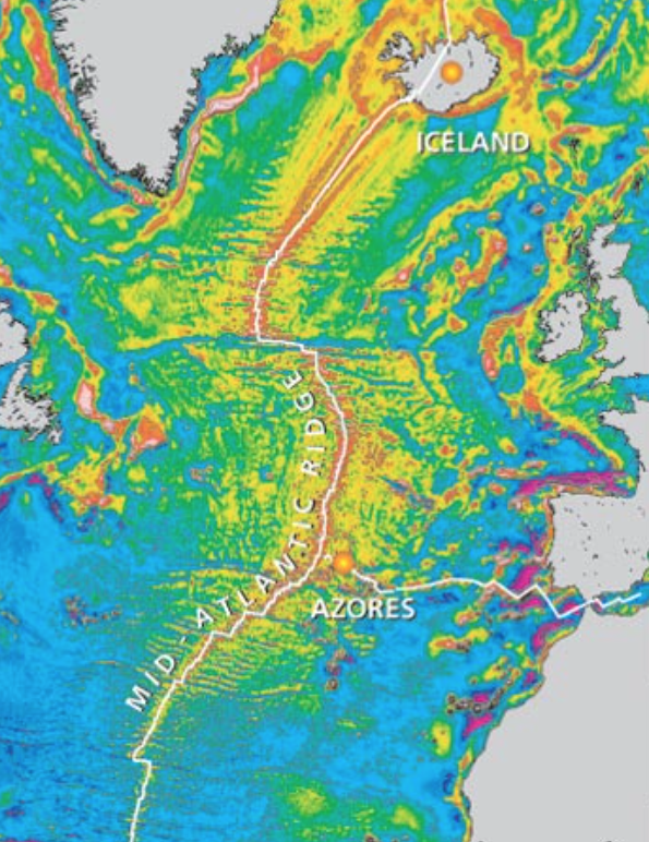 Iceland: Where A Hot Spot and Mid-Ocean Ridge CoincideIceland sits astride the Mid-Atlantic Ridge where it intersects with a mantle plume, resulting in frequent volcanic activity. The basaltic shield volcanoes along mid-ocean ridges have low-elevation and usually remain well below sea level. One notable exception is Iceland, on the Reykjanes Ridge section of the Mid-Atlantic Ridge. Gravity data obtained via satellite shows abnormally elevated ocean crust around Iceland (Fig. 25a), indicating that the ridge coincides with a mantle hot spot thermal anomaly. Iceland is composed entirely of basaltic rock from at least 130 volcanoes, of which 18 have been active in the past 1,000 years. Recent eruptions have been mainly in the south, along a new branch of the spreading ridge (Fig. 25b). In 1963–1969, offshore eruptions resulted in the formation of the new island of Surtsey. Heckla, which last erupted in 2000, and Eyjafjallajökull which erupted in 2010, are two of the most active volcanoes on the island.