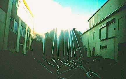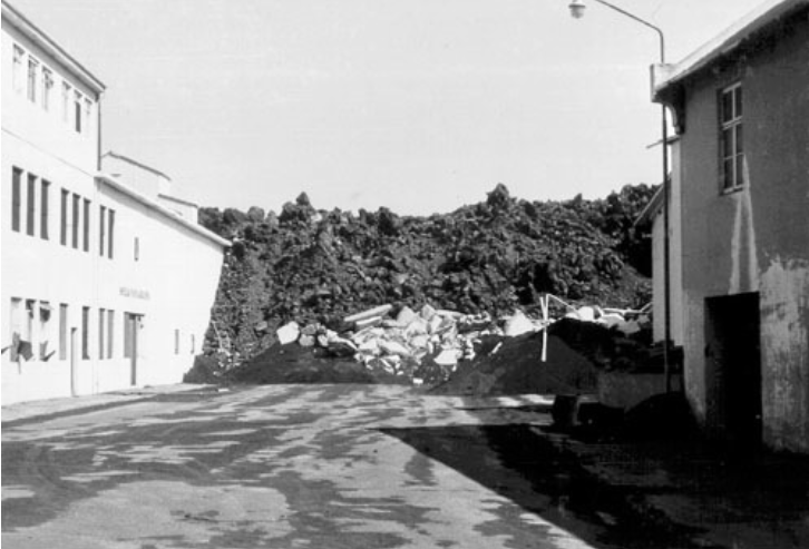 Trying To Stop A Lava FlowDrenching a lava flow with cold water may slow it down, although it is unlikely to stop it altogether. Iceland’s volcanoes have erupted many times since the island was settled and the islanders have learned to mitigate some of the damage they cause. In January 1973, Eldfell volcano erupted close to the fishing port of Vestmannaeyjar, in southern Iceland (Fig. 27a). Fishing vessels were used to evacuate most of the port’s citizens. The Icelanders erected protective barriers, but still a total of 400 buildings were destroyed by lava flows and tephra falls. As lava encroached on the harbor’s entrance, an attempt was made to freeze the molten rock by drenching it with millions of cubic meters of seawater (Fig. 27b). This approach was not entirely successful in stopping the flow, but may have helped to save some properties (Fig. 27c). After a few months, Eldfell’s eruptive activity ceased. The damaged parts of the town were eventually rebuilt and heat from the cooling lava was used to construct a district heating system.