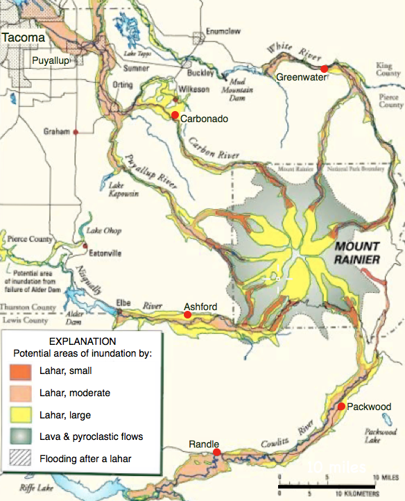 Volcanic Hazard MapsHistorical records of past eruptions are used to create hazard maps, which indicate the likelihood and type of a future event in a particular location. Understanding the risks from an active volcano depends to a large extent on knowing its past behavior. An example is Mount Rainier (Fig. 28a), an active volcano in the Cascade Range near the city of Tacoma, U.S.A. It has erupted four times in the past 11,000 years, the most significant event being 2,200 years ago, and is being closely monitored for any signs of renewed activity. A volcanic hazard map (Fig. 28b) has been constructed for areas surrounding Mount Rainier, based on past lava and pyroclastic flows, lahars, and present day geography. The map shows the most vulnerable areas in the valleys that radiate from the volcano. Volcanic hazard maps are not, however, foolproof. Nearby Mount St. Helen’s lateral blast in 1980 was unpredicted. The resulting landslide and volcanic debris covered an area 15 times greater than shown on its hazard map.