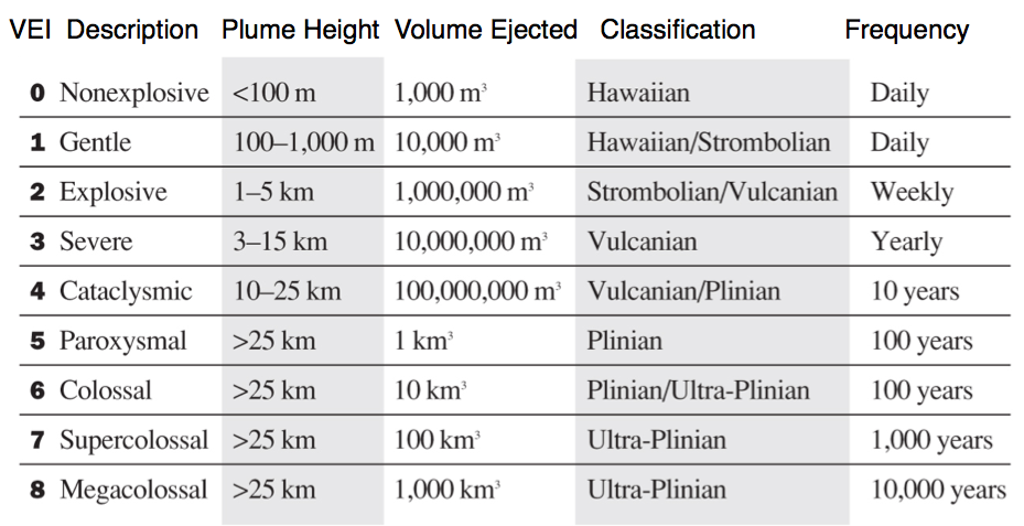 Measuring ExplosivityThe Volcanic Explosivity Index (VEI) expresses the violence of historic volcanic eruptions on a logarithmic scale. In 1982, researchers from the US Geological Survey and the University of Hawaii developed the Volcanic Explosivity Index (VEI) as a tool for use in assessing the likelihood of future violent eruptions from the world’s active volcanoes. The VEI expresses the relative violence of historic volcanic eruptions on a logarithmic scale of 0 to 8 (Fig. 29a). Assignment of a VEI of 0 means that eruptions are non-explosive, have a low volume of ejecta, a low (or no) ash plume height, and occur frequently. The basaltic shield volcanoes of Hawaiian Islands, such as Kilauea, are typically VEI 0. An eruption of VEI 8 is what we now call a supervolcano, a rare event with over 1,000 km3 of ejecta and an ash plume height of over 25 km, such as Yellowstone and Toba. For comparison, the Mount St. Helens eruption of 1980 was VEI 5, Krakatoa (1883) and Pinatubo (1991) eruptions were each VEI 6, and Tambora (Fig. 29b) in 1815 was a VEI 7.