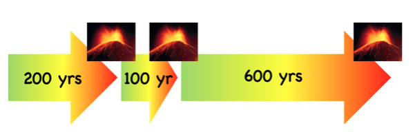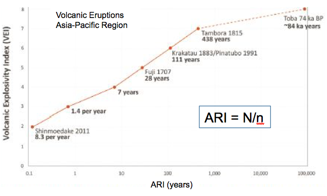 Eruption RecurrenceThe average time between eruptions is the eruption recurrence interval – an indicator, but not an accurate predictor, of future events. Anyone who lives near an active volcano (and their insurance companies) would like to know when the next eruption will occur. A measure often used is the Average Recurrence Interval (ARI), which is the average frequency of eruptions. To calculate ARI, it is necessary to know the number, n, of eruptions that occurred in time period N, which can range from years to tens of thousands of years (Fig. 30a). To estimate ’n’ often requires detailed geological research as well as data from historical records where these are available. Unfortunately, ARI is not very useful for small data sets (Fig. 30b) and says nothing about the possible magnitude of the event. Furthermore, even the best-behaved volcanoes can be unpredictable if the composition of the magma changes, or if new fractures or feeder pipes open to the surface such as after an earthquake.