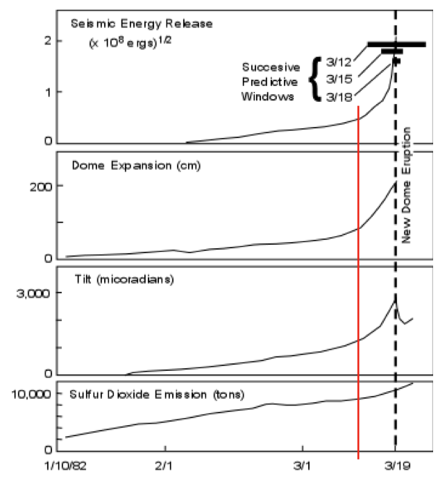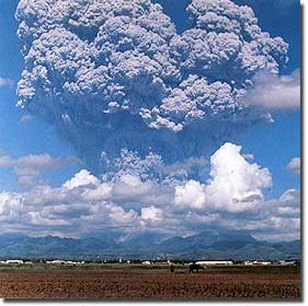 Monitoring Active VolcanoesAll active volcanoes around the world are now monitored for signs of an imminent eruption. As magma moves around inside a volcano, it fractures the surrounding rock, creating numerous micro-earthquakes. A significant increase in local seismic activity is therefore one indication than an eruption is likely. An increase in the quantity of gas emitted or a change in gas composition may indicate that magma is degassing its approach to surface. Changes in the volcano’s shape, such as steepening slopes or development of an unusual bulge on one flank, can also indicate that an eruption may be imminent (Fig. 31a). Although the timing of an eruption cannot be predicted with absolute certainty, most active volcanoes exhibit one or more of these precursor activities. There are now several international and national programs to monitor active and potentially active volcanos (Fig. 31b), and provide timely warnings to the public on the need to evacuate or take other precautionary action.