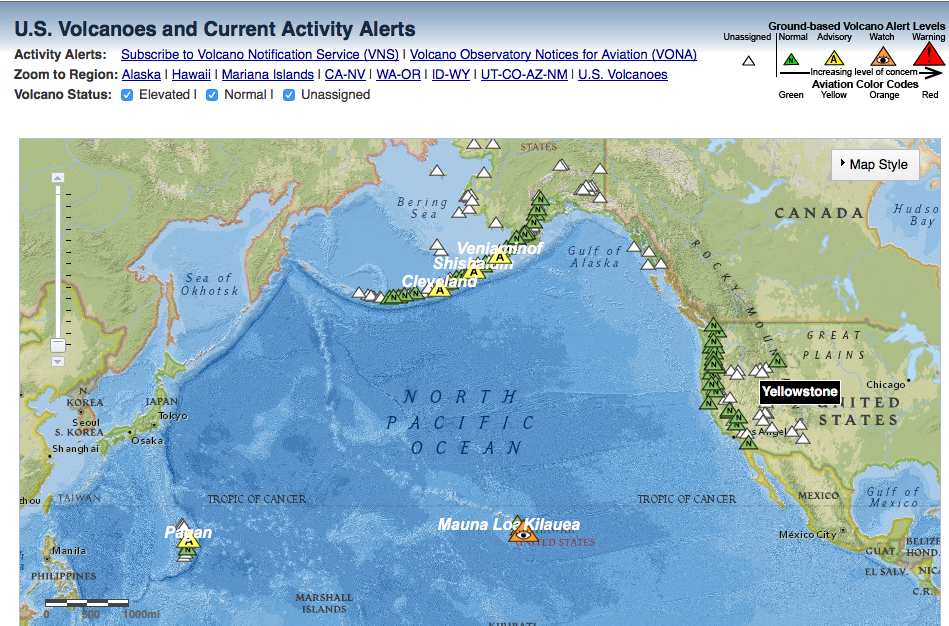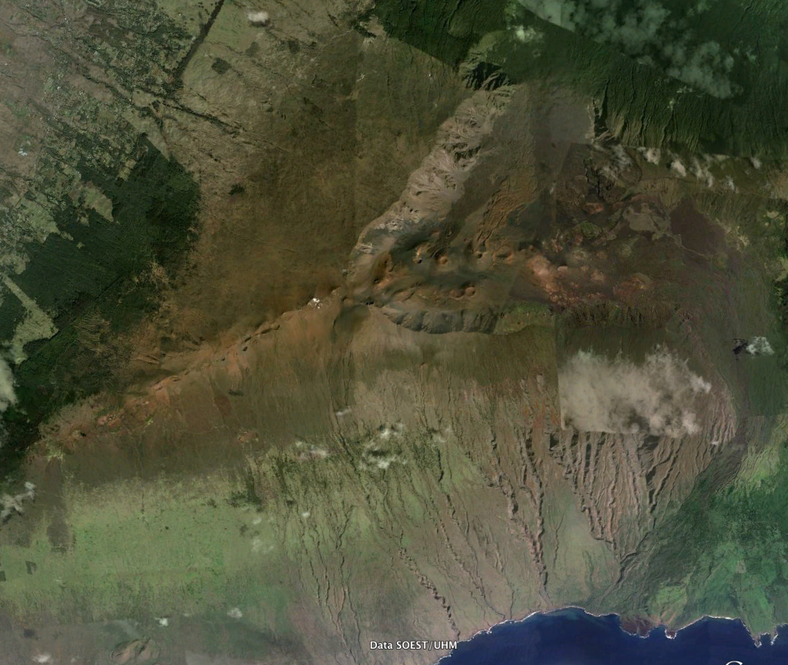 Active Hawaiian VolcanoesThe frequent eruptions from Kilauea and Mauna Loa cause destruction of roads, farmland, and property on the Hawaiian islands. One of the most active volcanoes anywhere in the world is Kilauea, on the island of Hawai’i. More than 60 separate eruptions have been recorded over the past 250 years and there have been eruptions somewhere on or around the volcano non-stop since 1983 (Fig. 7a). Kilauea’s neighboring volcano, Mauna Loa is the world’s largest active volcano. It has erupted 15 times since 1900 although only twice since 1950, in 1975 and 1984, which causes volcanologists to consider it due for another eruption. Nearby Hualalai last erupted in 1801 and is being monitored by geologists in case it shows signs of new activity. Haleakalā (Fig. 7b), on the island of Maui, is also considered active. Its most recent eruption occurred between 200 and 500 years ago and it is also under constant surveillance.
