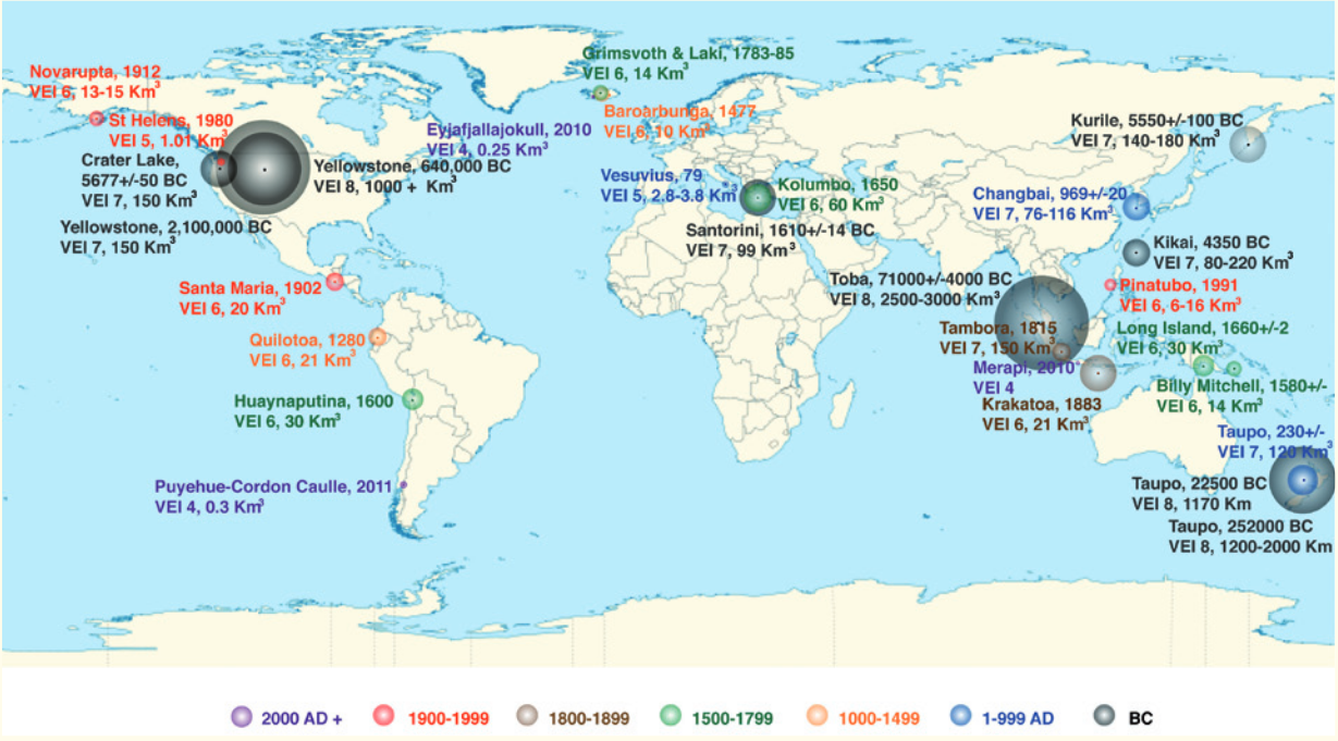 Promoting ResilienceResilience is defined as the ability to adapt to adverse circumstances. Providing information about volcanic risks does not mean precautionary measures will always be adopted. In a study published in 2000, researchers in New Zealand showed that 92% of city residents in Auckland were very aware of the likelihood of volcanic ash fall from nearby active volcanoes, however only 10% had stored food and water, 9% had a first aid kit, and 7% had an emergency radio. The study suggests that even where the hazards of living adjacent to active volcanoes are well communicated and understood, people may overestimate their own capability for resilience and may also assume that the authorities will take responsibility for everyone’s safety. Wide-scale community cooperation and trust are necessary to ensure adequate resilience to the rare, but potentially catastrophic, violent volcanic eruptions of the future. Figure 33 shows the frequency of eruptions greater than a VEI of 4 over the past 2 million years – roughly since the time that early humans began to spread round the globe. Although the VEI map in Figure V33 does not take into account the destruction from lahars or the effect of large volume gas emissions, the overview provides an indication of the potential volcanic risks for which populations in various parts of the world need to be prepared.