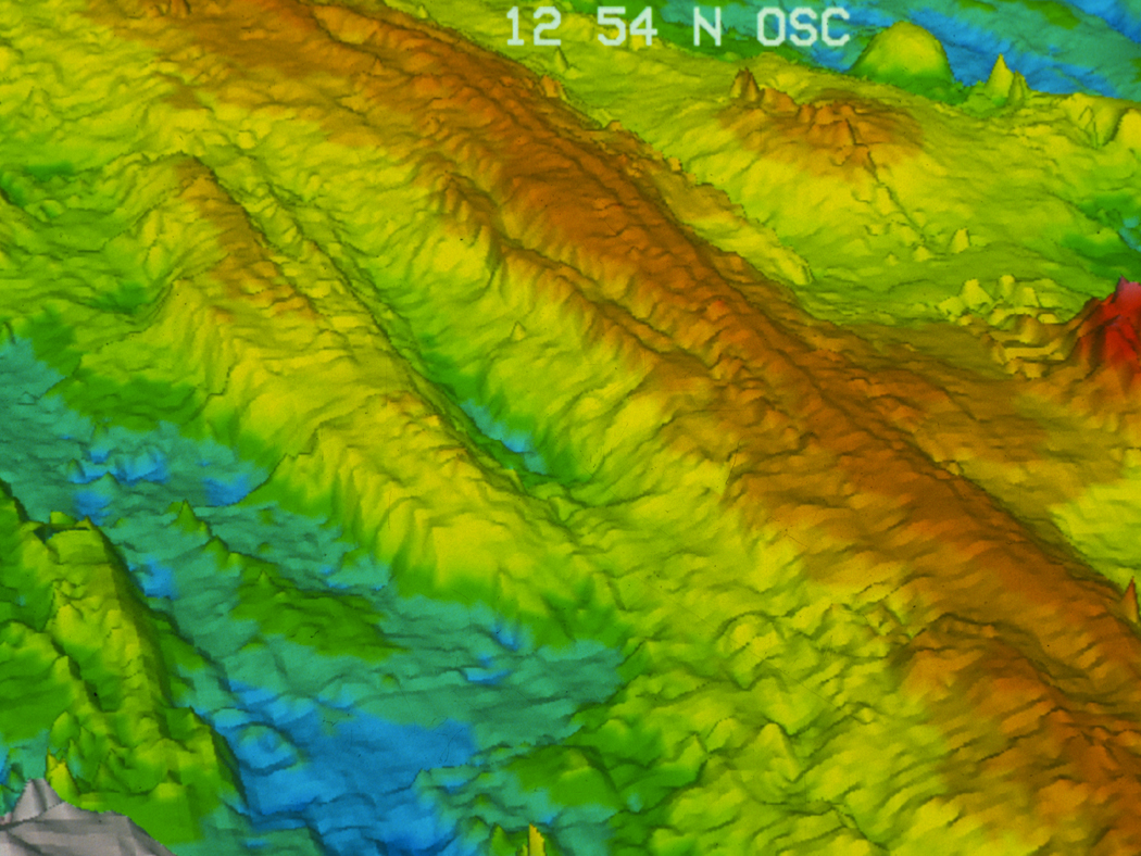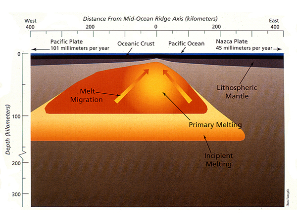 Mid-Ocean Ridge VolcanoesMagma eruptions on divergent plate boundaries are rarely noticeable, yet they have produced extremely long submarine mountain ranges known as mid-ocean ridges. New oceanic crust forms along divergent plate boundaries (Fig. 4a) by the frequent extrusion of basaltic lava from central underwater fissures that separate the two lithospheric plates. Hot magma beneath the plate boundary migrates toward the central fissure (Fig. 4b), slightly elevating the ocean crust’s surface. As the quietly extruded lava solidifies, the resulting basaltic rock forms long, narrow, volcanic ridges (Fig. 4c). The center line of the ridge splits apart with each new eruption, with the result that a symmetrical pattern is created on either side of the fissure as the rocks on one side move gradually away from those on the other side. These linear volcanic ridges link to form a 60,000 km-long, underwater mid-ocean mountain range that includes the Mid-Atlantic Ridge and the East Pacific Rise, among others.