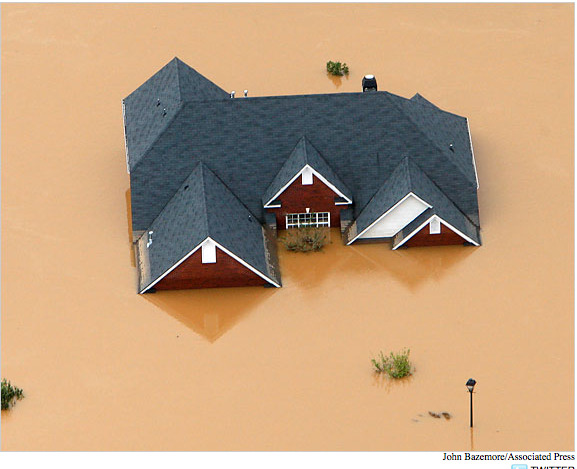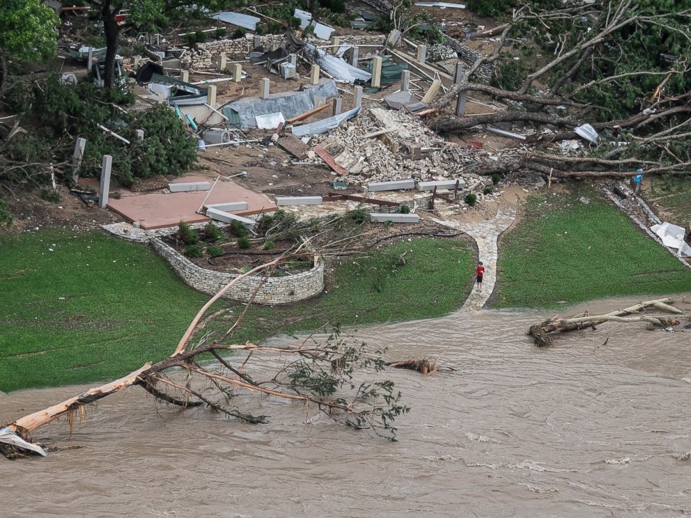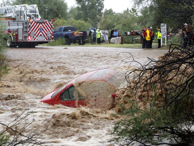 Flash Floods In The DesertOtherwise dry rivers in desert regions flood when surface runoff exceeds river channel capacity. The desert regions of the southwest U.S.A. are not usually thought of as high flood-risk areas, however they can be almost as flood-prone as the mid-western states (Fig. F10a), but for different reasons. Arid regions have little vegetation to impede surface run-off. What little rain does fall comes from isolated, high intensity thunder-storms that cause localized flash floods. The storms may be occurring a long distance away, but flash flood water travels quickly over the dried-out clays that line river beds, which are unable to absorb water fast enough. There is very little time to warn residents who may be in the path of the flood. Flash flooding from days of torrential rain in May 2015 destroyed hundreds of homes in Texas and Oklahoma (Fig. F10b). Later the same year, several days of unusually heavy rains and thunderstorms again caused destructive flash flooding throughout the states of Texas and Arizona.