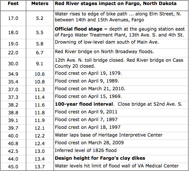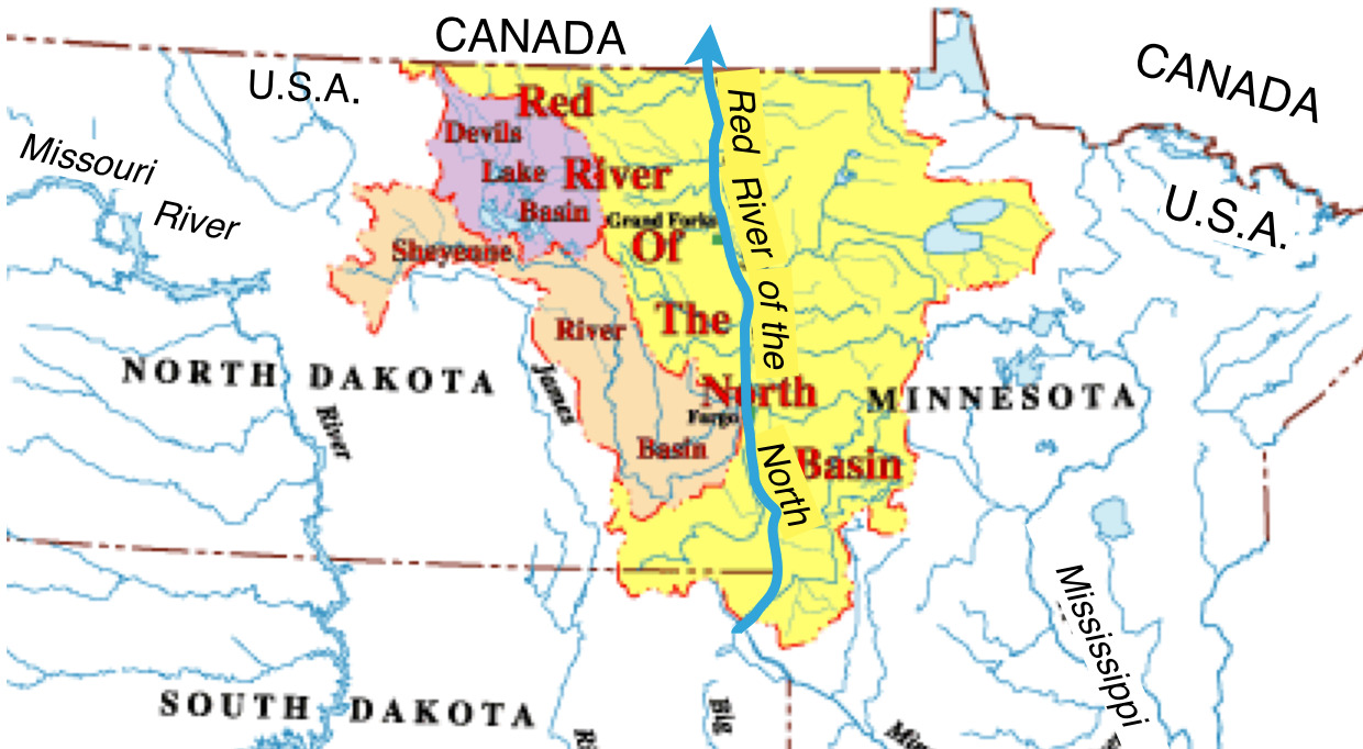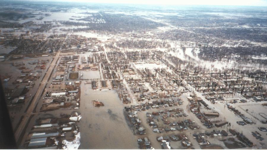 Snowmelt FloodsRapid snowmelt during exceptional warm periods or heavy rain often causes floodplain inundation. In the colder regions of the world, water from snowmelt runoff is a normal and major contributor to river discharge in springtime. However, spring rains on top of winter snow can cause very rapid melting that can result in a greater discharge volume than rivers and streams can accommodate. Snowmelt floods are common along the Red River of the North (Fig. F11a), which drains from Minnesota, U.S.A., northward into Canada. One of the river’s more extensive floods inundated several cities in its floodplain in April 1997, when very heavy snowfall from the previous winter began to melt in spring. Melting began as usual on the south-facing hill slopes of the river’s catchment area, but a sudden severe blizzard in early April re-froze sections of the river to the north and caused ice jams, which blocked the northward flow of the meltwater. The city of Grand Forks, ND was especially hard hit by the flooding (Fig. F11b).