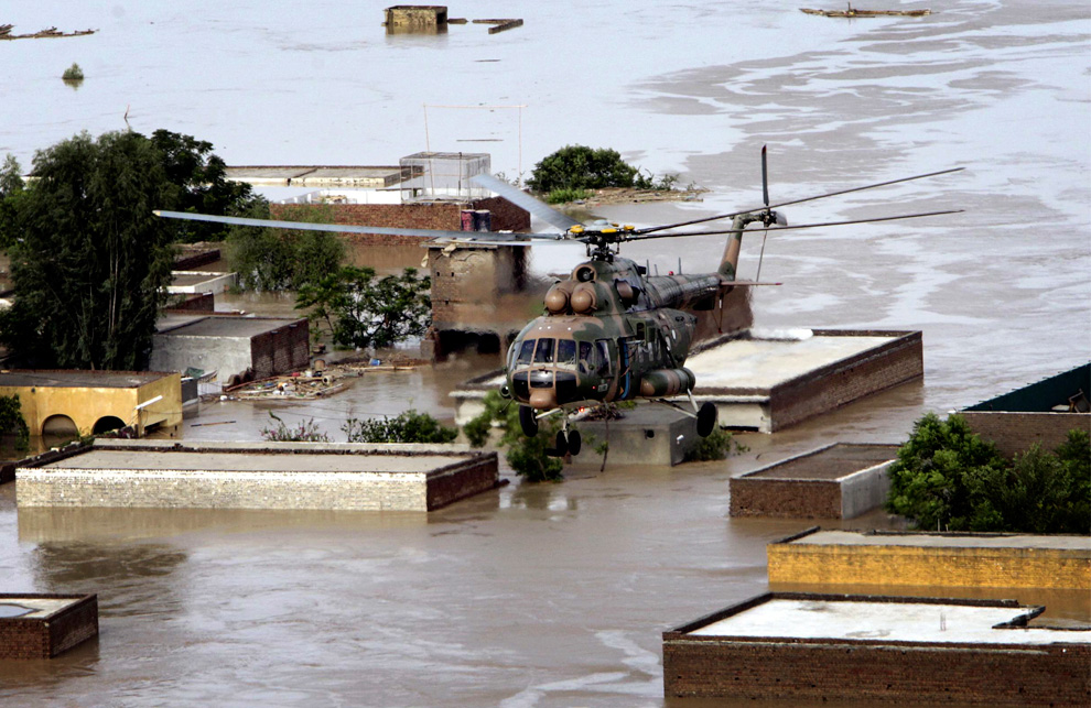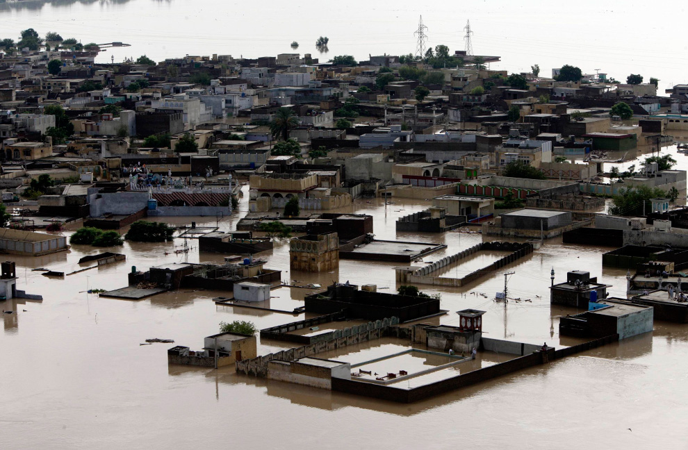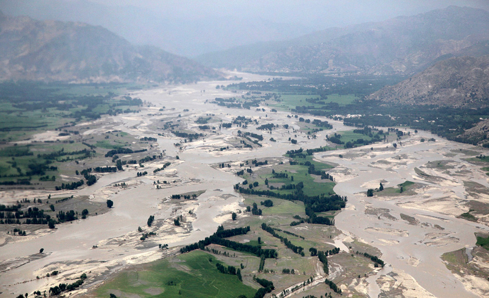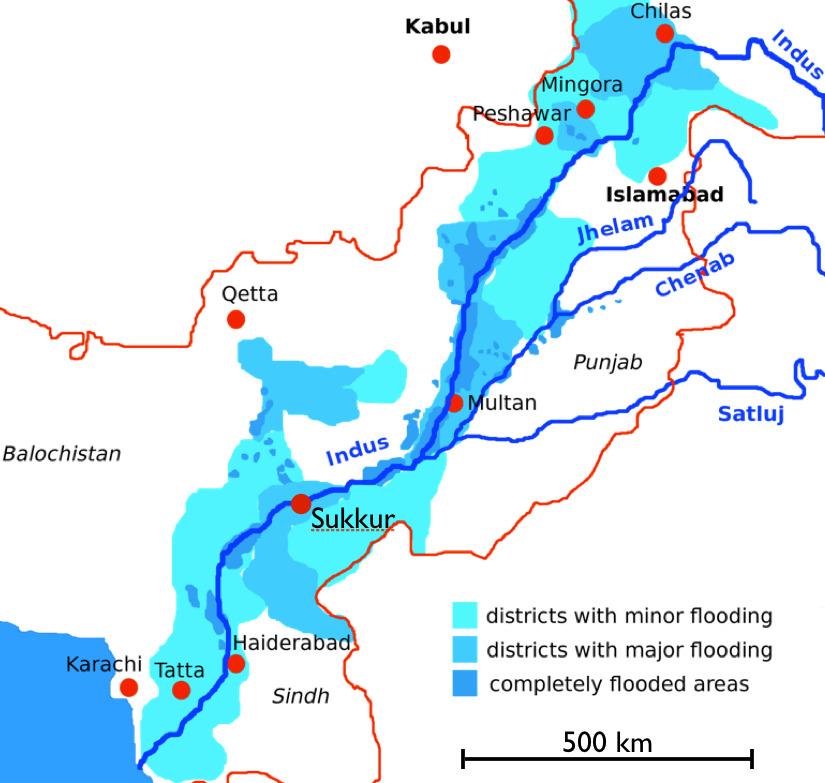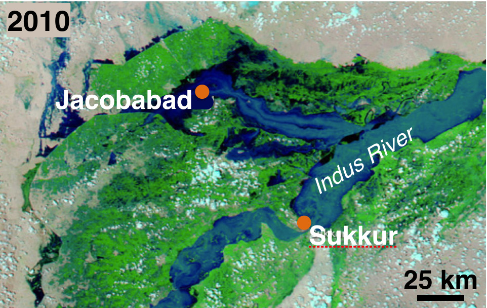 Indus River Flood, 2010Unusually heavy monsoon rains in late July and early August 2010 caused the entire Indus River floodplain to be inundated. In late July and early August 2010, several days of extremely heavy monsoon rain caused flash floods in the upper reaches of the Indus River, northeast of Peshawar, Pakistan (Fig. F13a). The floods caused hundreds of fatalities and the destruction of 160 km (100 miles) of roads, along with countless homes (Fig. F13b). Within a few days, the Indus River crested north of Multan, where almost 3 million people were affected by floods. As the flood crest moved down-river over the following weeks, the broad floodplain of the Indus River near the cities of Jacobabad and Sikkur (Fig. F13c) became overwhelmed by flood waters. Jacobabad was totally inundated by August 24 and large areas of Sikkur were also submerged. In this area alone, more than 1,500 square km (1,000 square miles) of land and at least 530 villages and 13 towns were flooded, and more than 500 km (300 miles) of roads were destroyed.