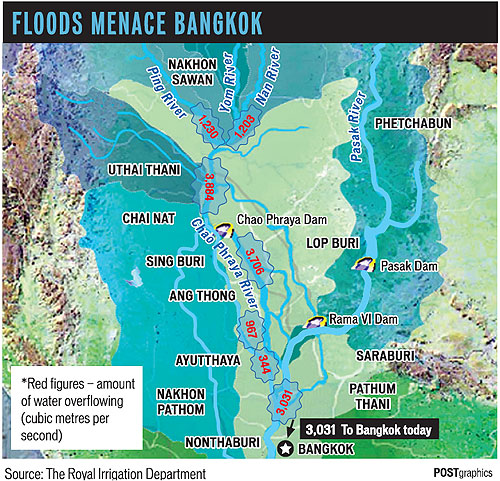 Monsoons And DamsDams are used to retain and conserve water and to control river discharge - not always with success. Monsoon rain in Indochina and southwest China regularly causes moderate floodplain inundation that farmers rely on for irrigation. The river discharge at any one time, and thus the degree of floodplain inundation, is controlled by the use of dams. However, unusually heavy rain in Thailand in 2011 overwhelmed the capacity of their dams and resulted in widespread destructive flooding. Intense rain began in the north of Thailand in May 2011 and continued for weeks in response to a strong La Niña. By August, the three large dams that normally regulate the Chao Phraya and Pasak Rivers’ discharge (Fig. F14a) were so full that they had to release water into already swollen rivers. Flood barriers failed as flood crests moved downriver, until by mid-October, towns in the central floodplain were flooded and the capital city of Bangkok was threatened. Industrial as well as residential areas were inundated (Fig. F14b).