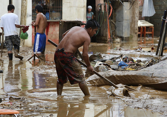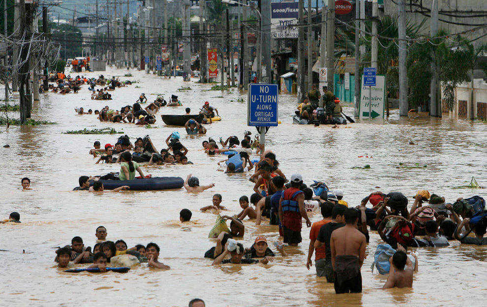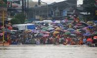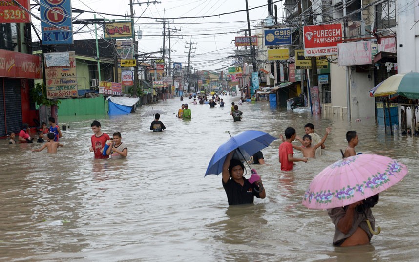Monsoon + Typhoon = DisasterMonsoon season in the Philippines coincides with tropical cyclone season. When storm and monsoon rains combine, the result is devastating flooding. Severe floods in the Philippines occur on an almost annual basis from one of the frequent tropical cyclones and/or from heavy monsoon rains. Unfortunately, the two seasons both occur during the late summer months. In September 2009, a record 455 mm of rain in 24 hours fell on Manila from Tropical Storm Ketsana, which combined with already heavy monsoon runoff and caused more than 700 fatalities (Fig. F15a). In August 2012, days of torrential monsoon rain were followed by Typhoon Saola. Over 850,000 people were displaced and more than 70 died (Fig. F15b). The following year, monsoons again flooded Manila. Heavy monsoon rain in October 2015 was augmented by 6 days of torrential rain from Typhoon Koppu (Fig. F15c). In that storm, over 500,000 people on Luzon were displaced and thousands of homes were destroyed, but early evacuations saved hundreds of lives.