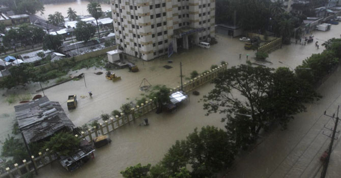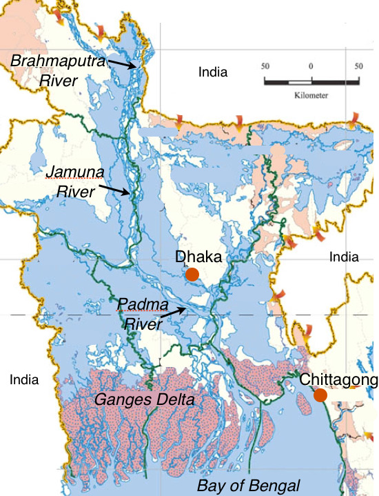 Flood-prone BangladeshMuch of Bangladesh is at a high risk of frequent flooding, from storm surge as well as monsoons. Some countries are more susceptible to flooding disasters than others. Bangladesh is highly vulnerable due to the density of people who live on its flood plains, which comprise over 80% of the country. Himalayan snow melt, flash floods, and intense monsoon rains regularly flood the Jamuna and Padma floodplains along the Brahmaputra river system (Fig. F16a), with loss of lives, homes, and farms. In addition, tropical cyclones that move into the Bay of Bengal cause major storm surge floods in the Ganges Delta, where the land is barely above sea level. Monsoons have caused devastating floods in the country many times in the past century. 1987 and 1988 were especially bad years, and in 1998 twothirds of the country’s crop lands, roads, and homes were under water, affecting over 30 million people. In 2004, monsoon rains created waist-deep water in the usually dry capital city of Dhaka, and in 2012 at least 100 people died in the port city of Chittagong after very heavy rains set off flash floods and landslides (Fig. F16b).