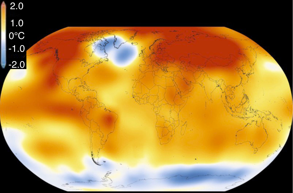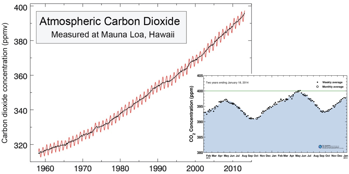 Climate Change And Sea Level RiseIncreasing atmospheric CO2 correlates with rising global temperature anomalies. Thermal expansion of warmed ocean surface water and melting of land-based glaciers contribute to sea level rise. Measurements of the carbon dioxide (CO2) concentration in Earth’s atmosphere have been carried out since 1958 at Mauna Loa, Hawaii (Fig. 17a). They show a significant increase in CO2 that correlates with a rise in global temperature anomalies over the same period (Fig. 17b). CO2 along with other so-called greenhouse gases, creates a thermal blanket that impedes heat escape from Earth’s atmosphere to space. Water vapor is the main greenhouse gas at low altitude, but CO2 dominates above the clouds, at the levels where Earth’s heat escapes to space. A warmer atmosphere means warmer ocean surface waters, and thermal expansion causes a volume increase of the warm water. The observed temperature increases are not uniform over the globe, but are greatest above the Arctic circle (Fig. F17b). Addition of melt water to the oceans from land-based ice and thermal expansion of ocean surface waters are the main contributors to current and projected global sea level rise.
