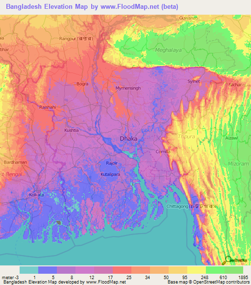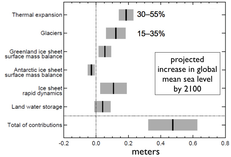 Sea Level Rise ConsequencesOver two thirds of Bangladesh is less than 20 m above sea level, as are many international cities. Estimates of expected global sea level rise in the next century vary considerably, but conservative estimates range from about 30 cm (about 1 ft) to 70 cm or even 100 cm (Fig. F18a). This may not seem like much to worry about, but in a country like Bangladesh it would be enough to permanently inundate the Ganges Delta region (Fig. F18b). Some estimates suggest almost 10 m in sea level rise for this century, although those estimates are not widely accepted at this time. Nonetheless, sea level rise is a topic of great concern for many countries. Half of the Netherlands is less than 1 m above sea level. Most of Singapore is less than 15 m above sea level. New Orleans has districts behind levees that are 2 m below sea level. In coastal California and in the south and southeast U.S.A., many cities will be affected by sea level rise of even the most conservative estimate. Other impacted cities include: Rio de Janeiro; Buenos Aires; Melbourne; Vancouver; Tokyo… the list is long. Coastal flood mitigation will certainly see greater global attention in the coming decades.