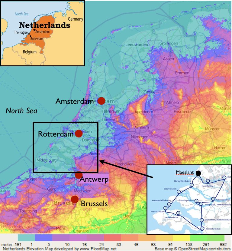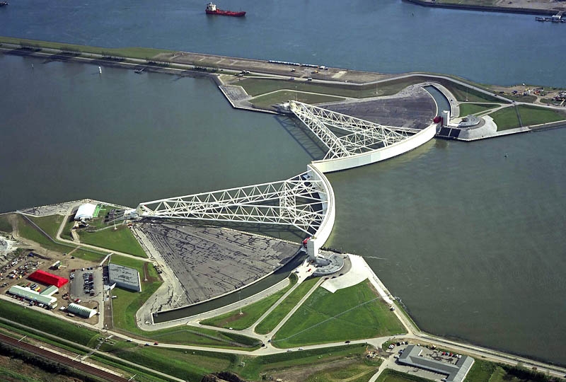 Tidal Barrier Flood ControlSeveral international cities are now building, or contemplating, tidal barriers against rising seas using the Netherlands as an example. The Netherlands provides an excellent example of a low-lying coastal region that has learned to manage river and sea flooding events. Almost two thirds of the country is below sea level (Fig. F19a). A farming system of polders and dikes (fields that are protected by levees) has existed since Roman times and has been mostly successful in controlling river flooding and tidal surge. However, in January 1953, a very high storm tide overran the coastal region, causing over 1,800 fatalities. As a consequence, Dutch engineers designed and built tidal barriers (Fig. F19b) to protect against storm tides. Recently, as part of an overall floodplain management program, the country has begun to lower the height of some of its river levees so as to allow farmlands to flood. Other low-lying regions around the world are looking to guidance from the Netherlands as they, too, try to protect their coastal cities from floods.