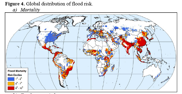 Class 8: Water Cycle and FloodsWater CycleFor an introduction to the global water cycle, see, e.g., UCAR (2011). FloodsWater is essential for life, and humans have a strong tendency to live and work close to water. While being close to rivers, steams, lakes, and the ocean may be convenient, it also comes with the risk of catastropic flooding. Heavy and continuous rain can lead rivers to flood and lake barriers to break. Close proximity to the ocean carries the risk of storm surges and tsunami inundation. Floods are the natural hazards that impact the largest number of people and cause the largest amout of damage. Catastrophic flooding can occur in any low-lying region adjacent to rivers, streams, or the ocean. Water is essential for life, and humans naturally live, farm, and fish near water sources. Close proximity to rivers and streams may be convenient, but there is a significant risk of flooding during times of heavy or continuous rain. Close proximity to the ocean carries the risk of storm surge and even tsunami inundation. The highest risk of catastrophic flooding occurs in low-lying coastal areas (Fig. F1a) and those regions most at risk from tropical cyclones, such as Central America, Southeast Asia, coastal Brazil, and the southeastern U.S.A. (Fig. F1b). Moderately high risk flood zones include mountainous areas that receive significant rainfall and inland regions where major rivers run through low topography, such as the Indian sub-continent (Fig. 1c), parts of south-central U.S.A., Europe, and east Africa. Lowrisk does not mean no-risk, as even arid regions can be inundated by unusually intense storms.