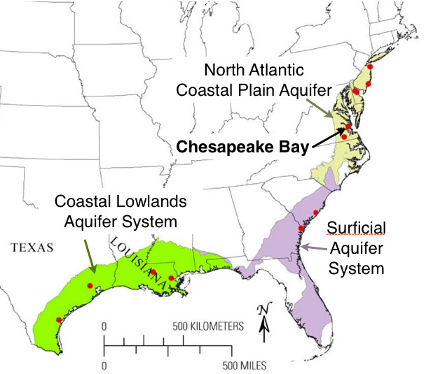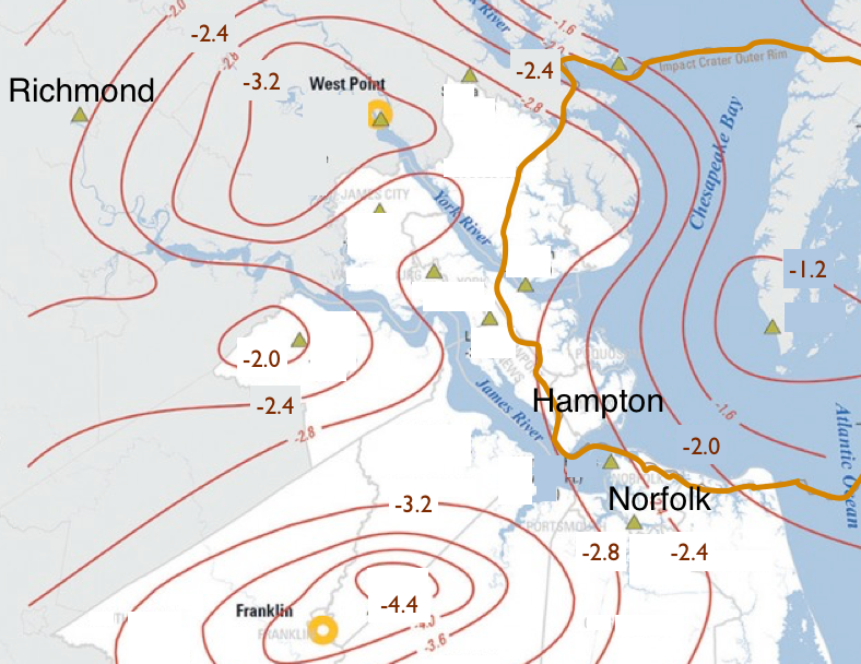 Post-Glacial SubsidenceSome land subsidence is caused by the Earth’s crust responding to the end of the last Ice Age. At the southern end of the Chesapeake Bay, in the mid-Atlantic coastal region of North America (Fig. F21a), the rate of land subsidence is accelerating at between 2 and 4 mm per year. Although this sounds like a very small increment of subsidence, by 2100 it will have added another 30 cms (roughly 1 ft) to the combined effect of aquifer draw-down, soil compression, and sea level rise on flooding vulnerability for the cities of Norfolk, Virginia Beach, and Hampton, among others. A substantial part of this subsidence acceleration is in response to the melting of northern ice sheets at the end of the last Ice Age. From New England northward, the regions of Earth’s crust that had been depressed under the mass of thick ice sheets during the Ice Age are slowly rebounding (rising in surface elevation) and, like a giant see-saw, the land to the south –which was not buried under ice – is slowly sinking (Fig. F21b).