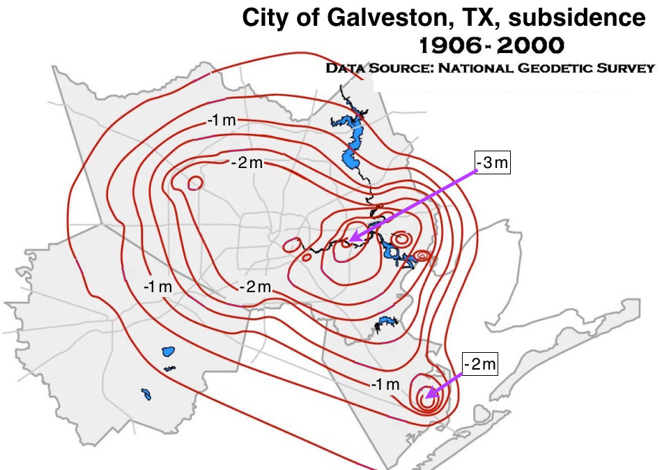 Sinking Land, Rising SeasLand subsidence from aquifer drawdown and concentrated property development compounds the impact of global sea level rise on coastal cities. Withdrawal of groundwater from an aquifer (buried layers of water-bearing rock or sand) allows the porous materials to compact and thereby creates a gradual subsidence of the ground surface above the aquifer. Ground subsidence from aquifer draw-down is of particular concern to coastal regions in the southern and southeastern U.S.A. (Fig. F20a), where mitigation of sea level rise must also take into account ground compaction beneath high building concentrations in cities and towns. For example, the City of Galveston, TX, has subsided by more than 2 meters (6 ft) and locally up to 3 meters just in the last century (Fig. F20b). Shanghai, China, is another coastal city that has sunk at least 2 meters since 1920. Other major coastal cities, including Bangkok, Jakarta, and New York, are facing similar predicaments.