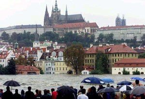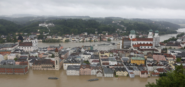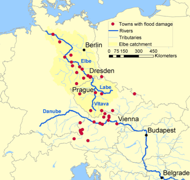 Floods In EuropeLarge regions of northern Europe have seen very destructive flooding in recent decades. Central Europe has been inundated by floodwater on numerous occasions in recent decades. Several of the region’s major rivers set record flood stage levels in 1954 when floodwater devastated towns in Austria, Germany, and what is now the Czech Republic. In August 2002, a week of continuous heavy rain in the eastern Alps caused extreme flooding all along the Elbe and Danube rivers (Fig. F23a) with more than 110 fatalities. The River Danube’s 1954 flood heights were surpassed in early June 2013 after 4 days of very heavy rain in the northern Alps, whose rivers drain into the Danube Basin. Prague, Passau (Fig. F23b), and other cities flooded. Again in December 2015, persistent intense rain from an atmospheric river fell over northern Europe, causing the evacuation of more than 50,000 people from Prague and surrounding regions as levees were breached and cities were again flooded (Fig. F23c).