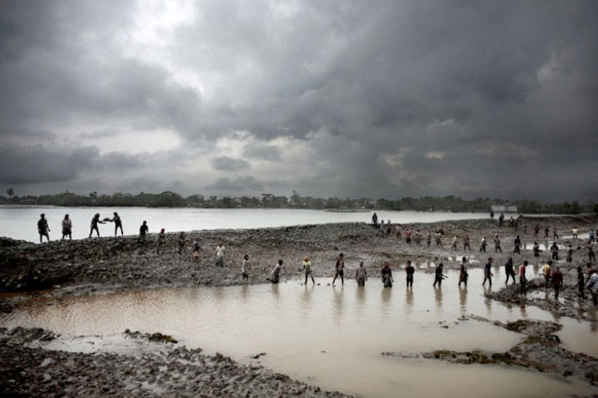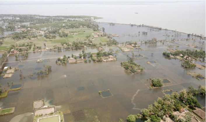 Evacuation Saves LivesEarly warning and evacuation procedures move vulnerable populations away from flood zones. When Tropical Cyclone Aila struck Bangladesh and eastern India in 2009, the evacuation of thousands of people from the storm’s path saved an incalculable number of lives. The total death toll caused by Aila was under 200, even though an estimated 2.3 million people were affected by the floods, which submerged towns, villages and large regions of agricultural lands (Fig. F26a). In October 2013, when Cyclone Phailin hit southeastern India, destroying towns, crops, and critical infrastructure, India’s early warning system allowed the evacuation of over 1 million people, with the result that fewer than 20 floodrelated fatalities occurred. A larger cyclone in the same region in 1999, when there was not yet an adequate warning system in place, killed 15,000 people. Similar results have been seen worldwide, including in Louisiana in August 2016 (Fig. F26b): the evacuation of people from imminent or actual flood zones saves innumerable lives.