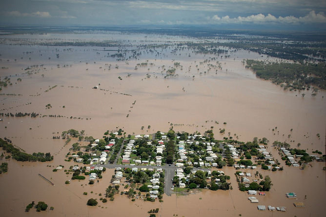 Population Relocation?If frequent flooding cannot be avoided, should entire populations be relocated? To anyone who does not live and work in a region that is prone to flooding, it might seem logical to relocate the affected population away from the coast or river that is causing the problem. Some towns are taking this approach, such as the town of Grantham on the Lockyer Valley floodplain in Queensland, Australia, which was devastated by a flash flood in January 2011 (Fig. F27). Residents of the region are being given the opportunity to relocate to higher ground through a voluntary land-swap initiative. Other cities and towns in Australia and elsewhere around the world are restricting new or replacement development in floodplains and requiring existing homeowners and businesses to obtain flood insurance. Unfortunately, not all vulnerable populations have the option to move. Island nations such as the Philippines, cities on low-lying coastal plains such as Norfolk, Savannah, and Charleston on the U.S.A.’s east coast, countries with agrarian economies such as Bangladesh, and very large cities such as Miami, Jakarta, New York, or Dresden, are not able to permanently relocate their residents away from potential flood risk. Their approach instead is to mitigate as much risk as possible by having well thought-out monitoring and evacuation plans, storm shelters, and flood prevention programs.