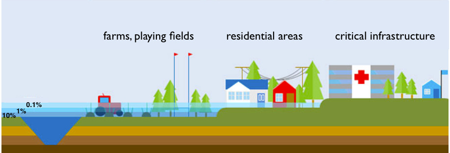 Many cities and towns around the world have developed flood inundation risk maps (Figs. F28a, b), using data from past events and sea level rise predictions to assess the probability of future flooding. These flood zone maps are used for future development planning, flood mitigation, and emergency preparedness planning.