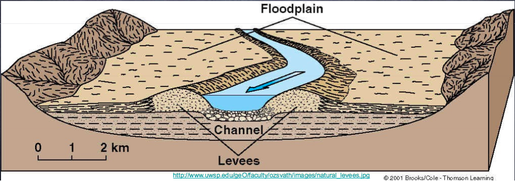FloodplainsFloodplains are the flat areas adjacent to river banks that have been built up by repeated floods. After exceptionally heavy or persistent rains, or during rapid snowmelt, surface water drains into streams and rivers faster than it can be carried away downstream. The presence of vegetation will slow down surface runoff, but not enough to prevent the river overflowing its banks and natural levees (Fig. F2a). Floodplains are the areas of flatlying land behind the levees, adjacent to the river; they are composed of sediments deposited from the river after repeated flooding events. Floodplains usually contain fine-grained, mineralrich silt, which helps to make fertile soil. Ancient Egyptians watched for the annual flooding of the Nile River during the rainy season and planted their grain crops on the river’s floodplain after the floods had retreated. Today, farmers around the world cultivate crops on floodplains (Fig. F2b), despite the risk that their crops could be inundated by flood water after heavy rainfall (Fig. F2c).
