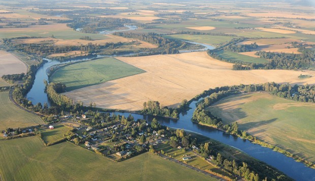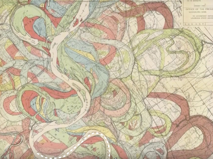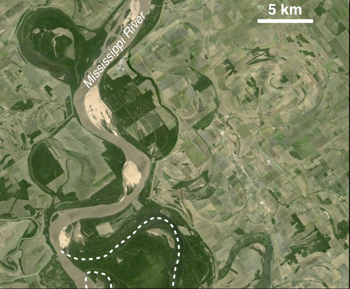 Meandering RiversRivers in flat-lying country meander about within their floodplains. When in flood, the river takes the easiest route downslope. In low-lying regions and areas that have a relatively flat topography, rivers seldom stay in the same channel for very long. The river water gradually erodes the outer curves of the river banks and deposits the sediment on the inner curves further downstream, so that the river channel migrates across the floodplain over time (Fig. F3a). Often, a river’s meander loop is so extreme that it approaches a teardrop shape, after which an increase in water velocity can cause the river to cut off the loop and take a shorter route down slope. The abandoned meanders are usually recognizable by soil and gravel changes (Fig. F3b). The Mississippi River in central U.S.A. is a typical meandering river within a wide floodplain that is intensely farmed. Figure F3b illustrates the river’s numerous long-abandoned meanders, many of which are clearly still visible on satellite imagery.