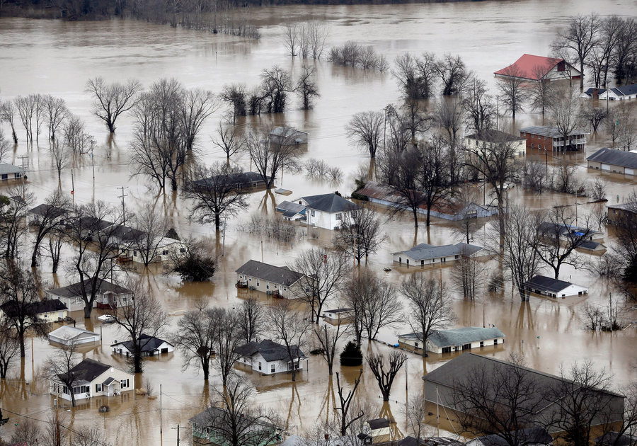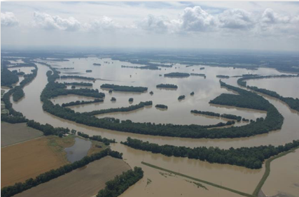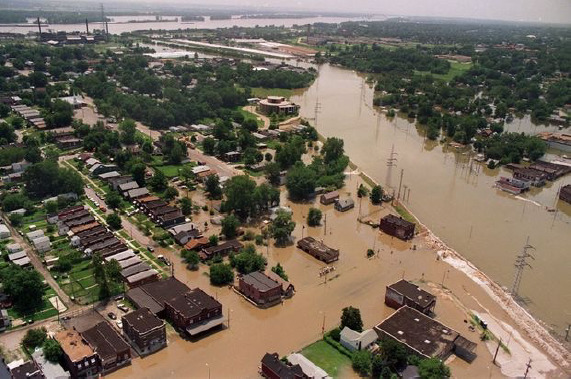 Midwest U.S.A. FloodsThe Mississippi River system includes several large tributary rivers, each of which has caused repeated devastating floods. Excess water in any of the feeder rivers of the Mississippi River system (Fig. F7a) doesn’t only spill onto their own floodplains, but can lead to extensive flooding of the Mississippi floodplain as well. Flood waters from the Upper Mississippi, Missouri, and Illinois Rivers have frequently inundated the city of St. Louis, MO and its surroundings; the Ohio River adds to the flood threat for the city of Memphis; and water from the entire Mississippi River system flows via New Orleans into the Gulf of Mexico. Countless levees have been built over decades to protect the cities and towns that continue to be developed and expanded in the midwest U.S.A. floodplains. Despite careful engineering, extreme flood stages regularly cause the failure or overtopping of these levees, resulting in widespread damage, disruption and, inevitably, flood-related fatalities (Fig. F7b).