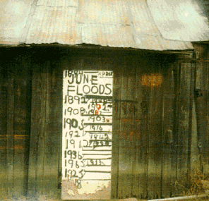 The 100-Year FloodA “100-Year flood” is a 1% probability of a flood of a certain volume in any given year. River and stream flooding is a normal and frequent occurrence. The term “100-year flood” means that there is a one-in-a-hundred (1%) probability of a flood of a certain volume occurring in that particular area in any given year. It does not mean that such a flood will only occur once in 100- years (Fig. F5a). Similarly, a 500-year flood means there is a 0.2% probability in any given year. How often a river or stream floods depends on the regional climate, frequency of severe storms in the catchment area, and the local topography. A 100- year flood could occur several times in a century, and even in two consecutive years. Probability assessment relies upon historical data to establish the base-line for flood frequency and discharge rates. Previous flood crest heights and other inundation information (Fig. F5b) are used as part of the planning process for building flood mitigation structures such as artificial levees.