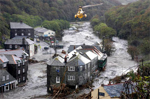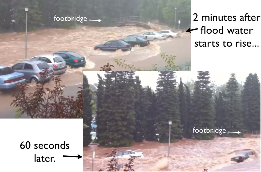 Flash FloodsFlash floods occur unpredictably.after severe thunderstorms or a sudden release of snow melt. Flash floods are the most dangerous of all flood types because they occur without warning in response to an event that may be far away from the scene of the flood. When rain falls much too quickly for it to be absorbed or drained away at a steady rate, the surface water funnels into numerous narrow streams which then coalesce into a torrent that surges along the river bed (Fig. F9a), often picking up large amounts of debris from the stream and river banks along the way. There is usually only a very short time interval between the intense rainfall and the start of the flash flood surge. As the flood front moves downstream, the flood waters behind it rise extremely rapidly (Fig. F9b) and the flood stage can become very high, especially in narrow mountain valleys. Many deaths are caused by people greatly underestimating the rapidity with which the water can rise in a flash flood.