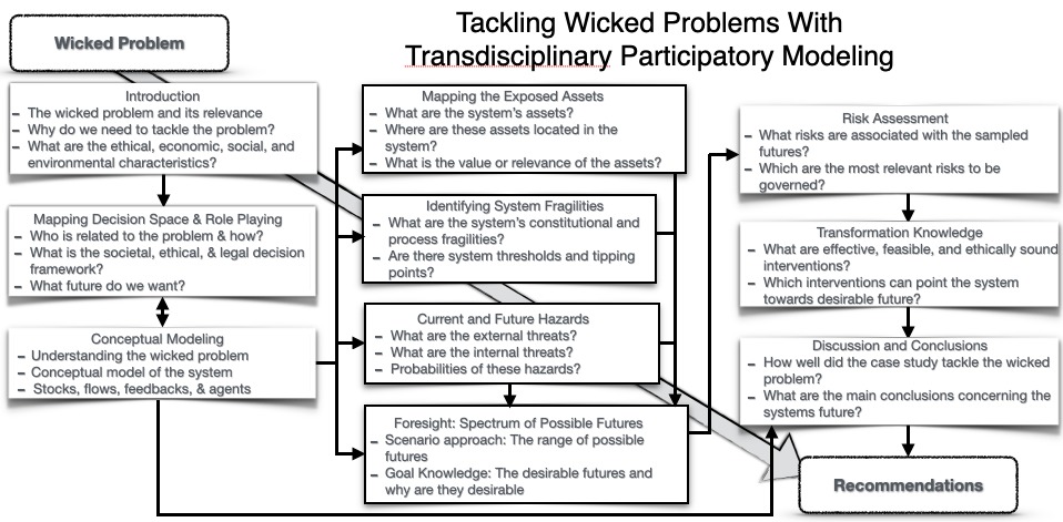 For each problem, there is an underlying system that can be conceptualized and modelled. The template underlines the importance of modeling for the understanding of the current and future system trajectories and the development of viable options will be emphasized. The opportunities and limitations for mitigation and adaptation interventions result to a large extent from societal decision making processes and the general basis of human decision making, which requires a deep understanding of the decision space. Importantly, decision and policy making needs to be informed by foresight comprising the full spectrum of possible futures of the system under consideration. The system is exposed to hazards, and many of these hazards are resulting from the on-going planetary reengineering that is pushing the planet out of the Holocene. Understanding the probability density function of these hazards is a prerequisite for developing foresight. Knowing the vulnerability to these hazards of the integrated socio-ecological and economic system of system associated with each wicked problem provides a basis for risk assessments to these hazards. Combining systems knowledge with reasonable scenarios for societal and environmental developments provides the means to explore the spectrum of possible futures and can help to develop the needed foresight. Based on that, interventions that have the potential to put the system on a trajectory towards a desirable future can be identified, and recommendations can be made.
