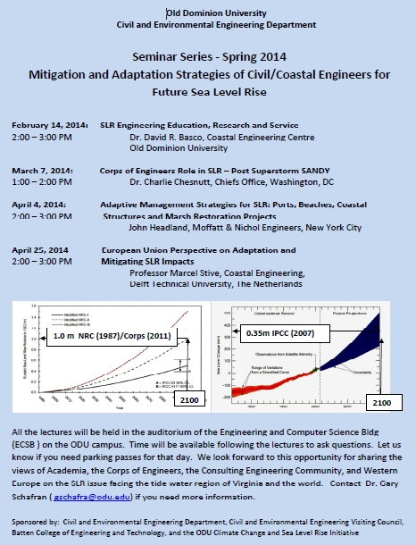 The Civil and Environmental Engineering Department at ODU organized a Seminar Series on Mitigation and Adaptation Strategies of Civil and Coastal Engineers for Future Sea Level Rise. The lectures took place on Friday afternoons in the auditorium of the Engineering and Computer Science Bldg (ECSB ) on the ODU campus. Time was available following the lectures to ask questions. The seminar was sponsored by: Civil and Environmental Engineering Department, Civil and Environmental Engineering Visiting Council, Batten College of Engineering and Technology, and the ODU Climate Change and Sea Level Rise Initiative.