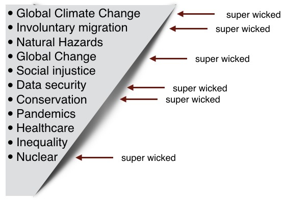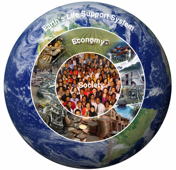 Human communities are embedded in the planetary life-supports system and linked to the ELSS through flows of materials and energy (Fig. 2). For humanity as a whole, sustainability can only emerge is these flows do not degrade and deplete the ELSS. Unlike for other animals, for human communities these flows are regulated by ethics, social norms, and – more recently – economic rules (Plag and Jules-Plag, 2017). This emphasizes the central role of ethics and social norms for sustainability. Since a few hundred years, economic rules have an ever increasing weight in the determination of flows between humanity and the ELSS as well as within humanity. In fact, in modern times, economy provides the link between the ELSS and the human communities embedded in the ELSS. With this mainstream economic model increasingly determines whether sustainability can emerge or not. Based on the notion that “the purpose of a system is what it does” (POSIWID, Beer, 1985), it is clear in Fig. 2 that the de facto purpose of economy is to meet the needs of humans while safeguarding the ELSS, on which the welfare of all human and non-human communities depends. The “official” purpose of modern economy introduced by Smith (1776), i.e., the creation of human wealth, is not in agreement with the de fact purpose, and a divergence of de facto and official purpose often lead rapidly to unsustainability. The current growth-dependent mainstream economic model requires ever increasing flows, and thus, this model is in direct conflict with the requirements for sustainability to emerge. The curricula of the mandatory courses are centered on understanding the importance of flows both for sustainability and conservation. The role that ethics, social norms and the mainstream economic model play for the regulation of these flows both between ELSS and humanity and within humanity is emphasized in all assignments and research conducted by the students. ![]() ![]() Figure 2: Humanity in the planetary life-support system. Similar to all animal communities, human communities are embedded in, and interact with, the planetary life-support system. Left: For human communities, almost all interactions with the ELSS are part of the economy. Right: Sustainability of a community emerges among others as a result of the flows of material and energy between the community and the ELSS. Modified from Plag and Jules-Plag (2017). 4 Wicked Problems in Sustainability and ConservationMost sustainability and conservation-related planning problems are wicked problems (Fig. 3). Wicked problems are social or cultural problems that are difficult or impossible to solve because of incomplete or contradictory knowledge, disagreement about the problem definition, the number of people and opinions involved, the large economic burden associated with progress towards a solution, and the interconnected nature of these problems with other problems (Rittel and Webber, 1973). In short, a wicked problem has innumerable causes, is tough to describe, and does not have a right answer. Addressing environmental degradation, terrorism, and poverty are classical examples of wicked problems. Wicked problems are the opposite of hard but tame or benign problems, which can be solved in a finite time period by applying standard techniques. Not only do conventional processes fail to tackle wicked problems, they also may exacerbate situations by generating undesirable consequences. 4.1 Wicked ProblemsRittel and Webber (1973) give ten characteristics that turn a problem into a wicked problem: